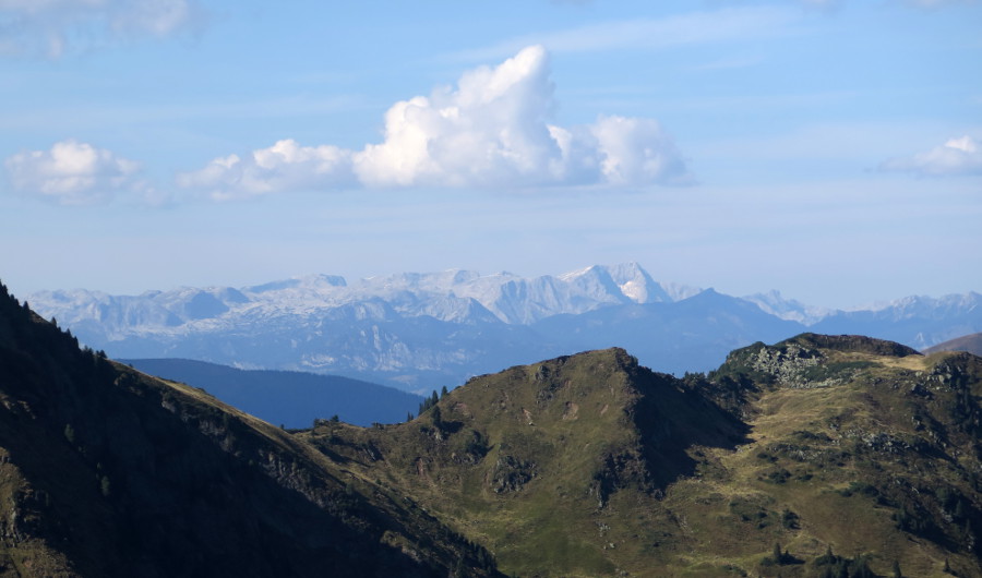 Im Vordergrund links der Hochwart (2301m), rechts Grimming und Totes Gebirge.