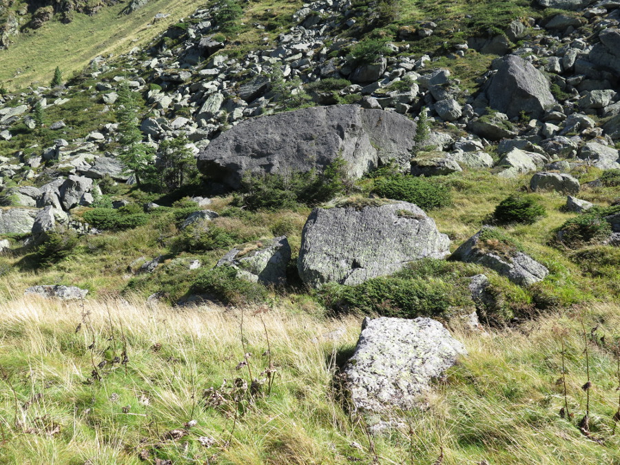Hier wuchsen gleich drei verschiedene Nadelbäume auf den Felsblöcken, eine Lärche, Fichte und Zirbe meine ich zu erkennen.