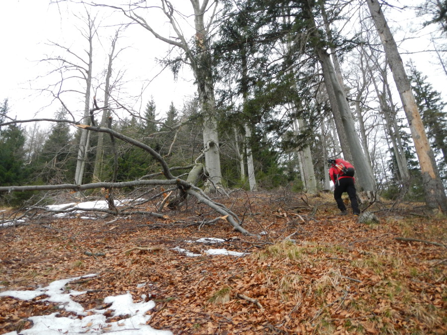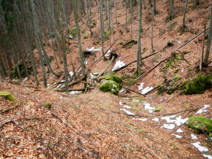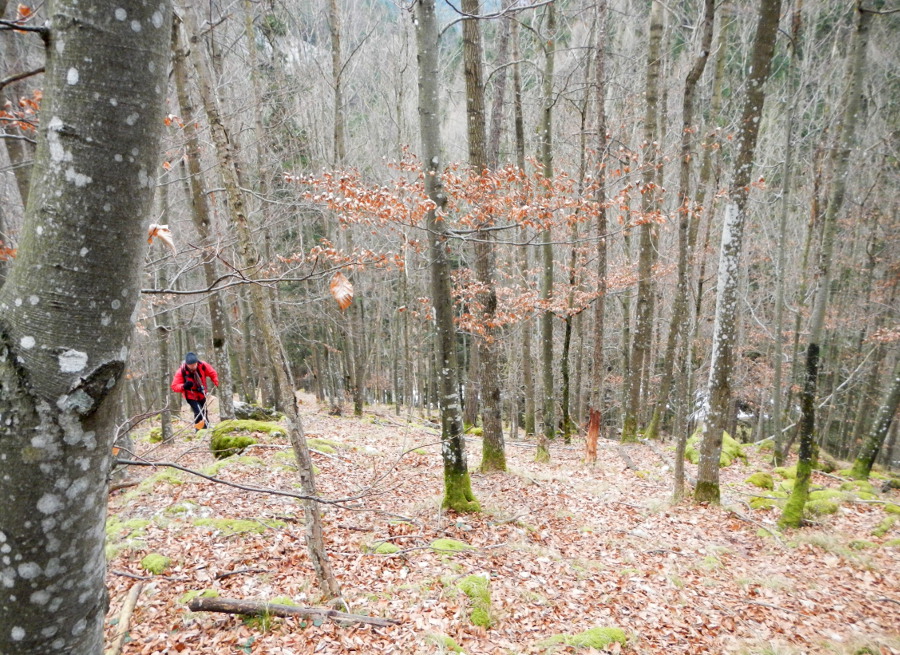 Dann folgt ein wegloses Stück lange Zeit rechts einer steilen Felsrippe. Wegspuren bzw. Wildpfade führen sukzessive hinauf, teils recht steil und über zahlreiches totes Unterholz.