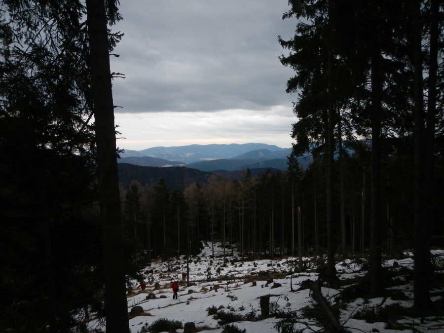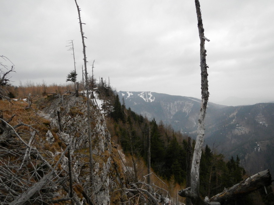 Zudem fehlen vielfach die Wipfel, die die Eislast nicht mehr tragen konnten. Im Hintergrund die Hohe Wand von der zahmen Nordseite.