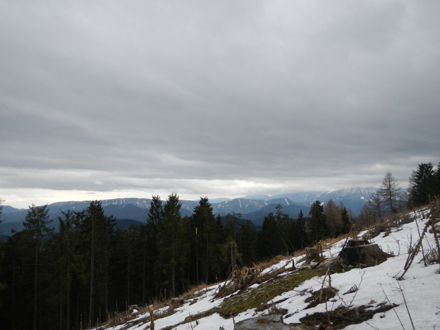 Der Fadensteig war teilweise ausgeapert und sicherlich ordentlich vereist. Im Vordergrund der lange Rücken der Dürren Wand, die sich über Öhler und Schober fortsetzt.