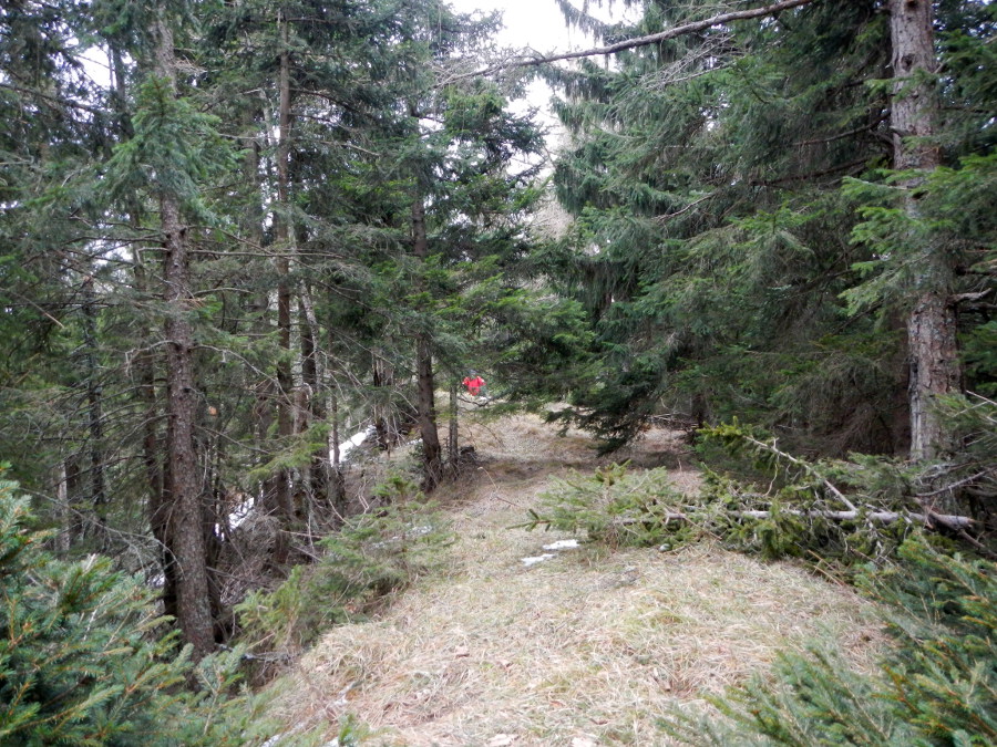 Nach ergebnisloser Sucherei im teils tiefen Altschnee und zwischen dichten Fichten verpassen wir den Westgipfel, obwohl wir uns mit GPS am höchsten Punkt wähnen. Egal.
