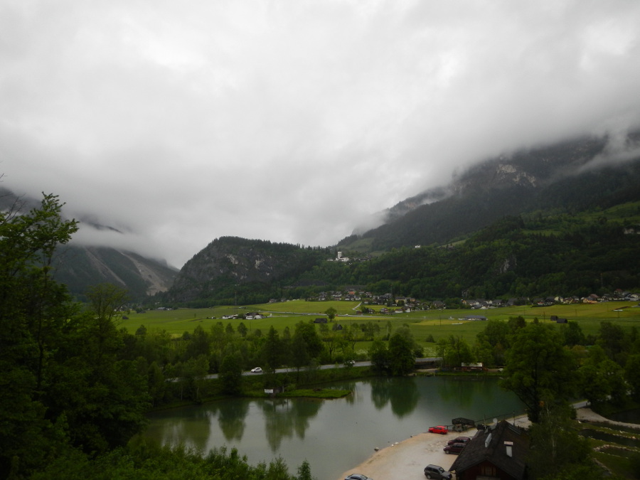 Bild 14: Blick vom Zugang zum Schloss auf den Fischteich, gegenüber Pürgg mit mächtiger Wehrkirche. Der Mugel links ist der Burgstall, dahinter schließt der Grimming an.