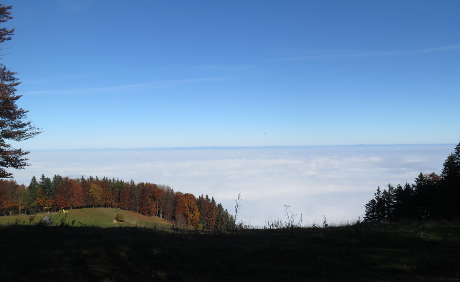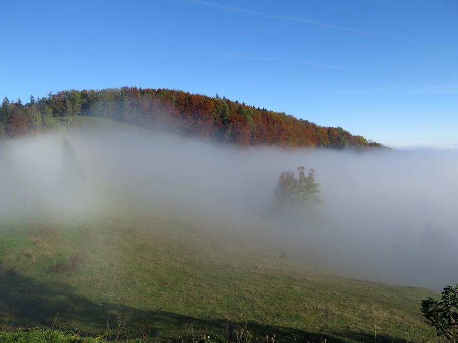 Bild 15: Bei einer größeren Wiese geht der Blick weit übers Nebelmeer ins Mühlviertel, links der Bildmitte Plöckenstein, Dreisesselberg und einzelne Gipfel des Bayerwalds.