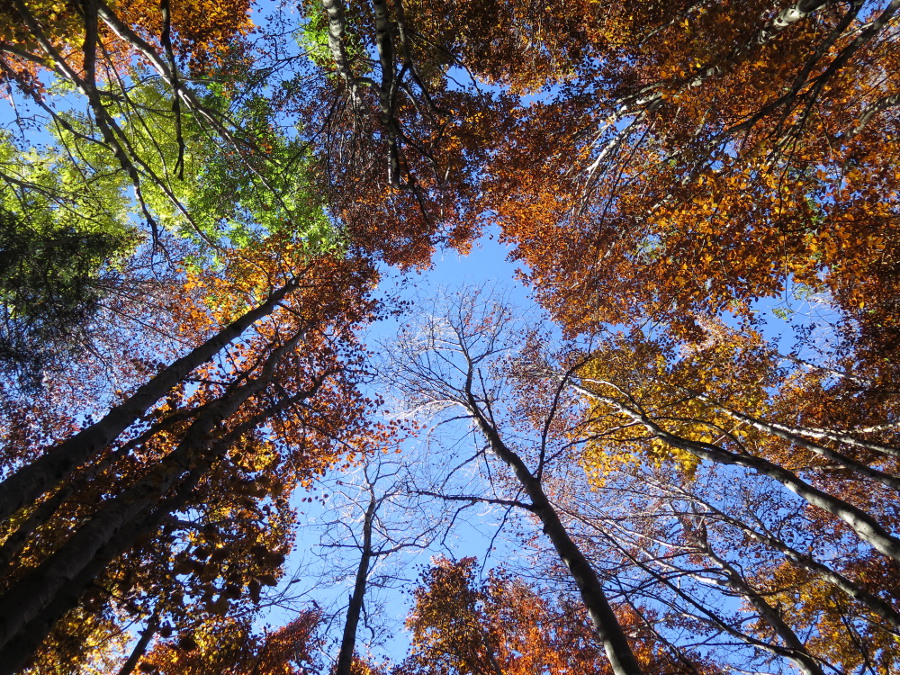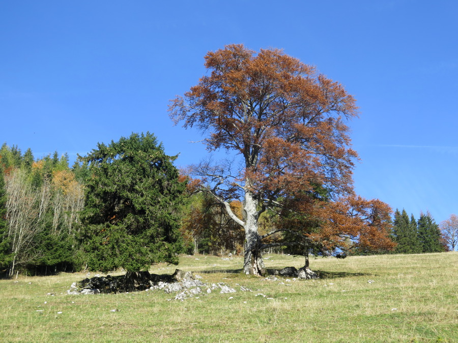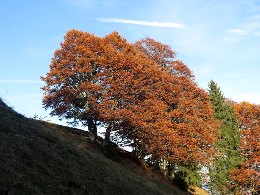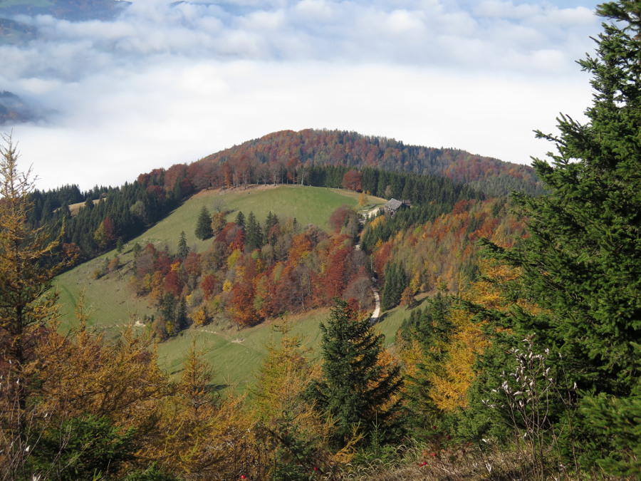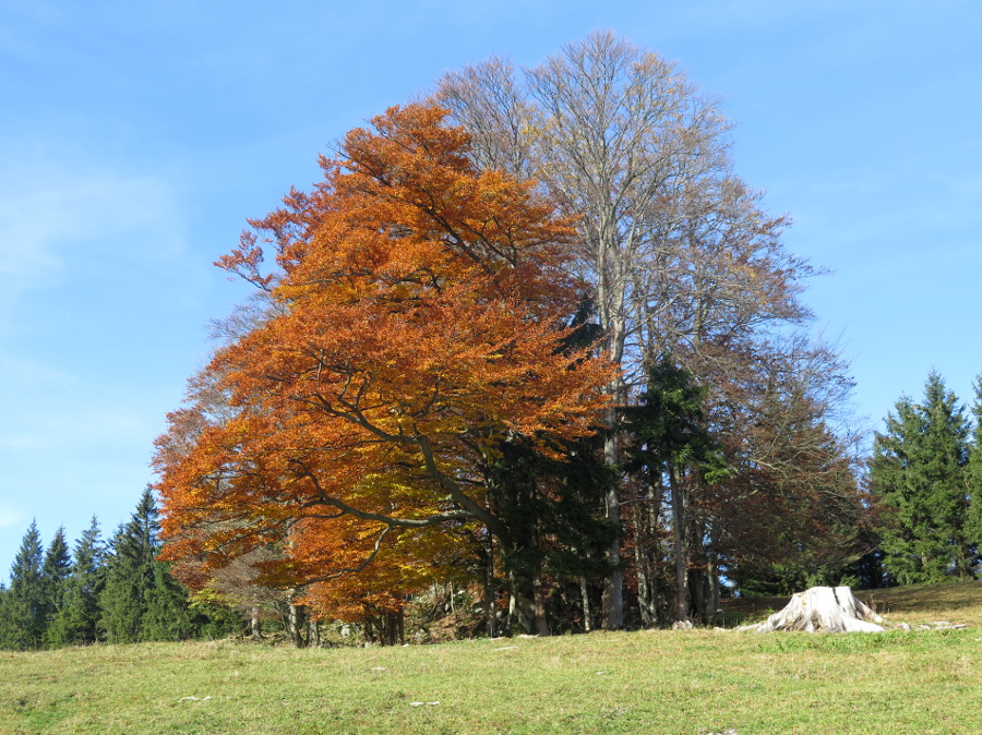 Später vom Pfaffenboden wird klar, dass man vom Hochbuchberg durch lichten Wald bzw. einen Schlag relativ bequem direkt absteigen kann. Da ich das Gelände nicht kannte, entschied ich mich dagegen. Zudem sah ich unten am Forstweg eine schöne Bäume und hoffte auf weitere Motive.