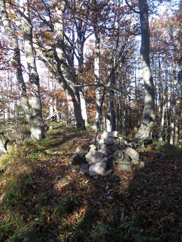 Bild 21: Das Gipfelmarterl mit großem Steinmandl und Sitzbank steht im Wald ohne Aussicht.