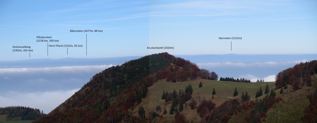 Und wieder zeigt sich, dass man nicht unbedingt auf die Gipfel muss, um grandiose Fernsichten zu erleben. Hier schälen sich die Gipfel an der Dreiländergrenze D-AT-CZ klar und deutlich aus dem Hochnebel, weiter rechts werden auch Erhebungen im Mühlviertel sichtbar, am prominentesten Sternstein.