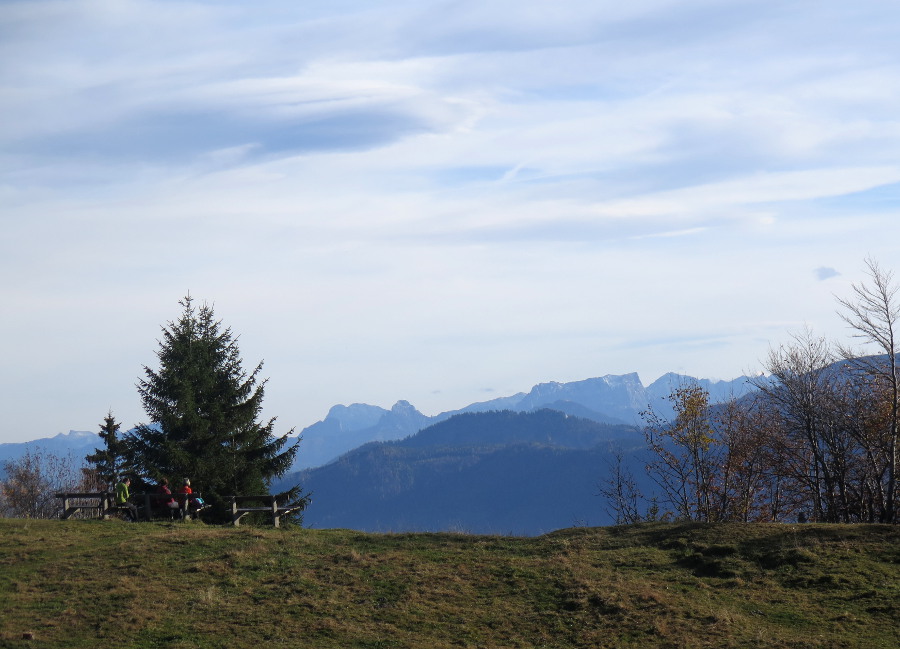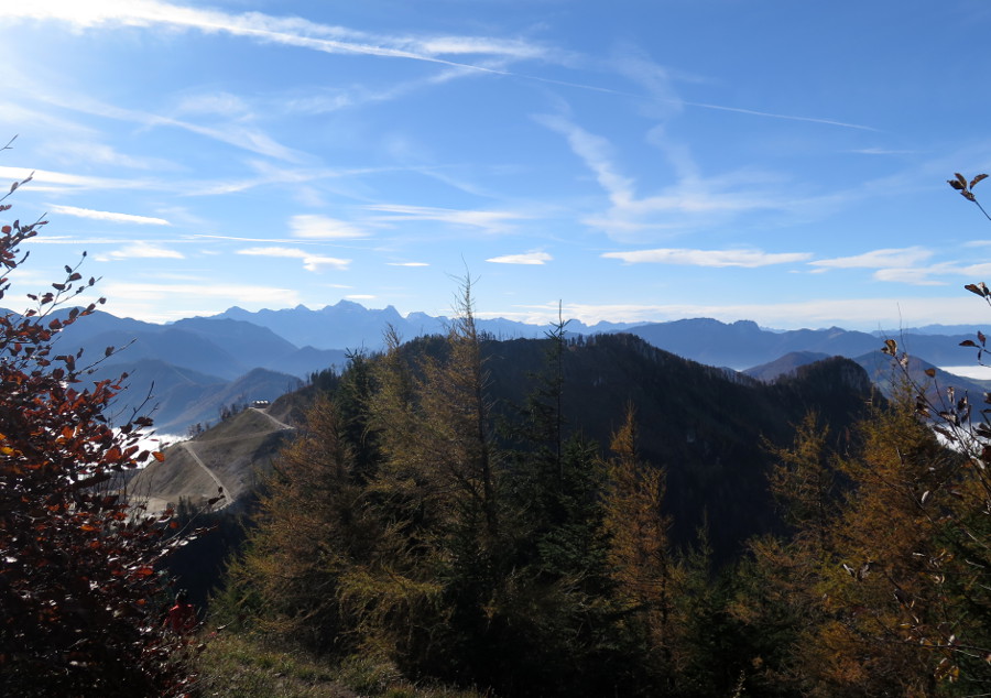 Im Hintergrund schaut der Hohenstein (1195m, 90 km) über die Einsattlung, weiter rechts auch Eisenstein (1185m, 85 km) und Reisalpe (1399, 102 km)