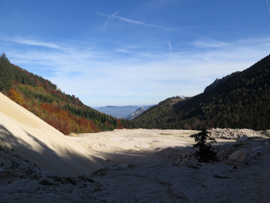 Das Kapitel Steinbruch hätte ich jetzt gerne ausgeklammert, aber äh... ja. Der Wegweiser zeigte unspezifisch in Richtung Steinbruch und Verbotstafel. Wenige Meter dahinter befand sich ein Wegweiser mit Angabe Grünburger Hütte bzw. Schoberstein. Ich ging ein Stück weiter, sah keine Markierung mehr, dafür einen riesigen Sandhaufen.