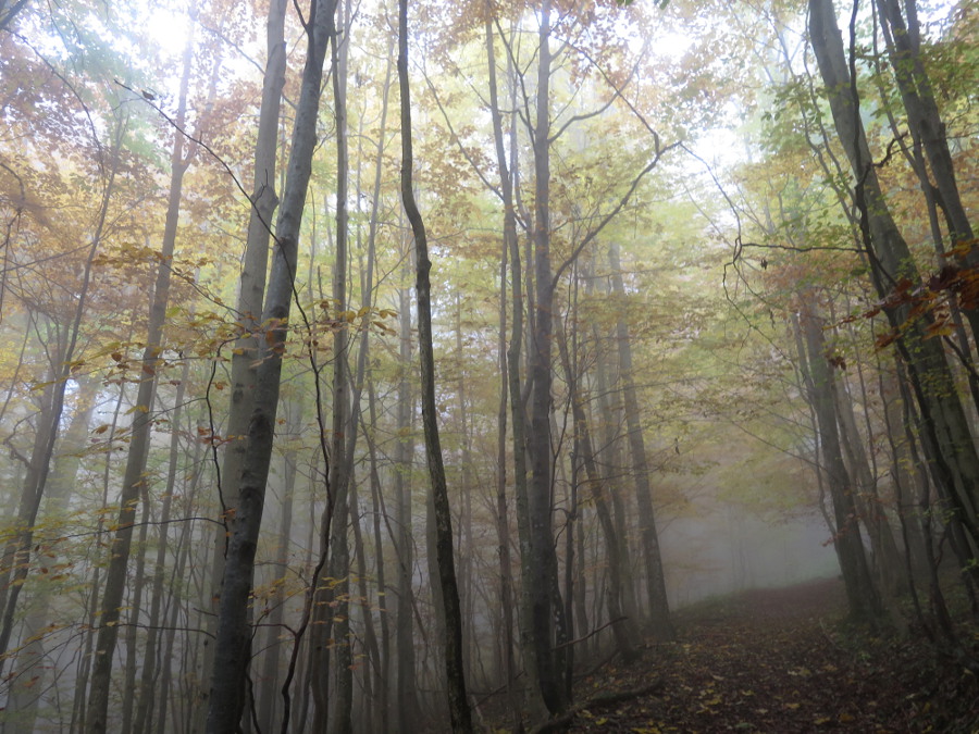 Es tropft von den Bäumen, gleichzeitig wird es langsam milder. Ein gutes Zeichen, ich konnte nicht mehr weit von der Nebelobergrenze entfernt sein.