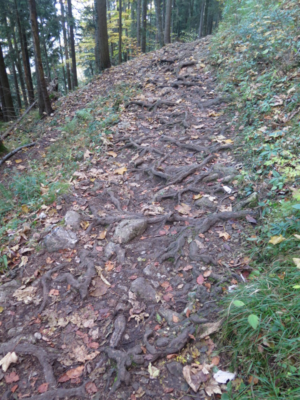 Eine Mischung aus Wurzeln und Steinen, über weite Teile schmierig, urglatt und gatschig.
