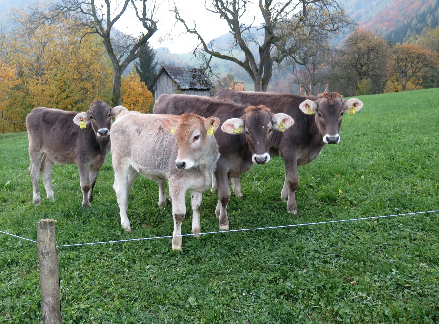 Eigentlich wollte ich vom Klausriegler nach links den Klausbach entlang absteigen, der Wegweiser Richtung Bahnhof deutet aber nach rechts. Die Wiese ist gatschig und der Weg ist erneut schmierig, sodass es mich fast aufhaut. Wieder auf der Asphaltstraße spare ich mir den Fußweg am Hang zur Beisteinmauer und gehe gleich auf der Straße weiter durch Trattenbach durch, wo die berühmten Trattenbacher Zauckerl (Taschenfeitel) seit dem 16. Jahrhundert hergestellt werden.