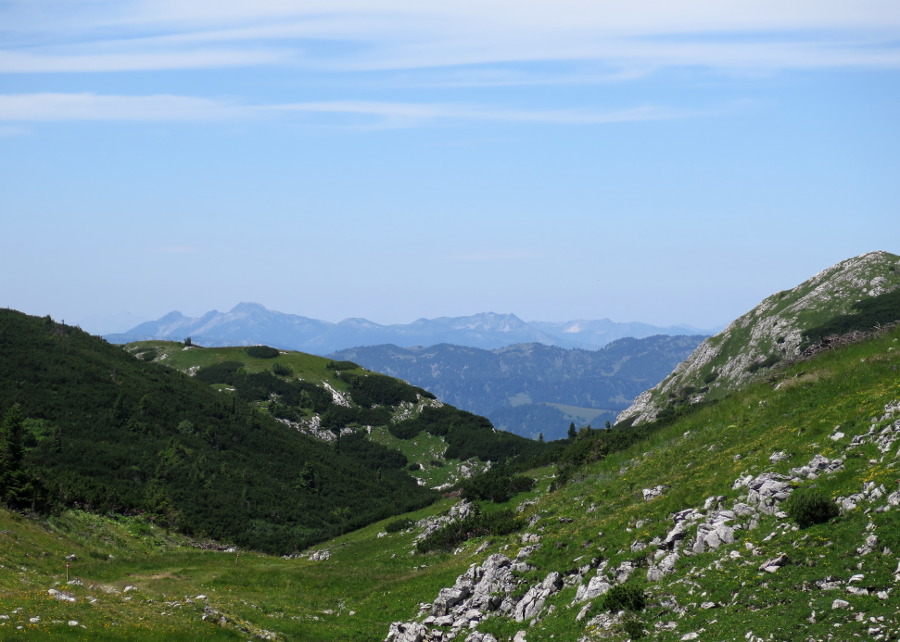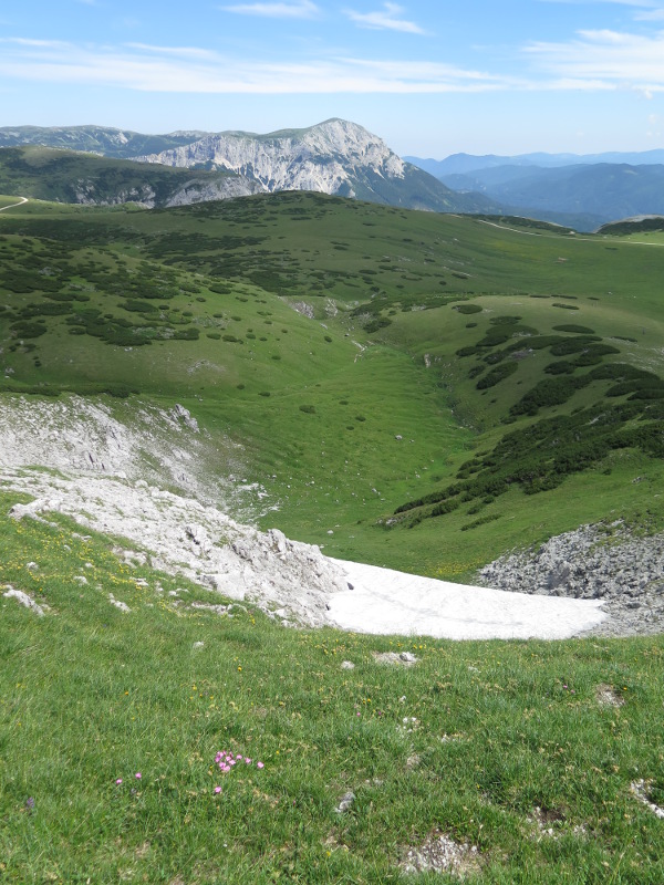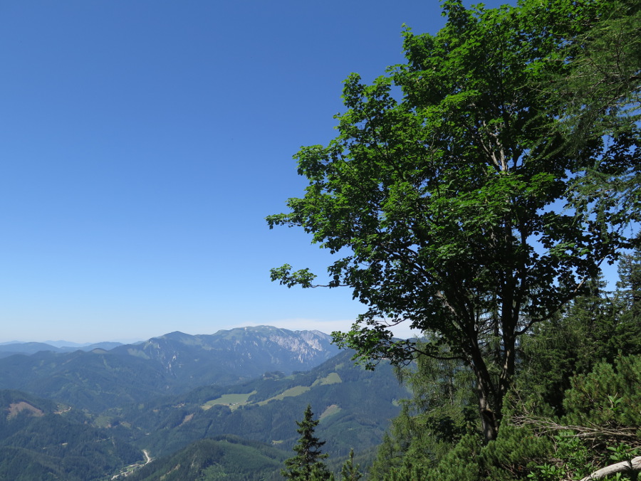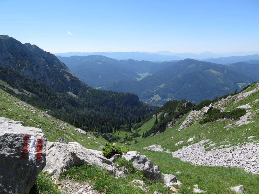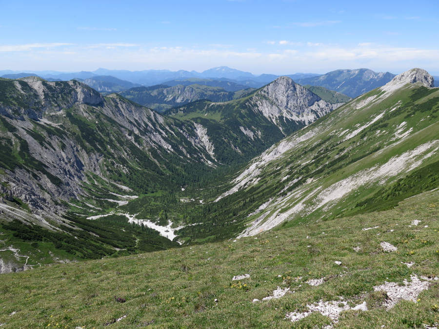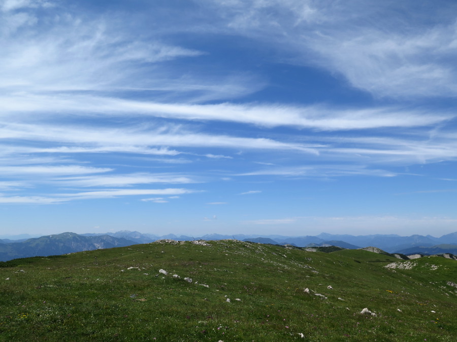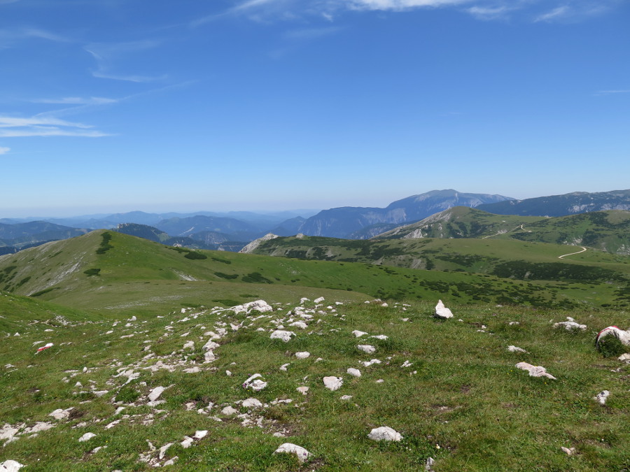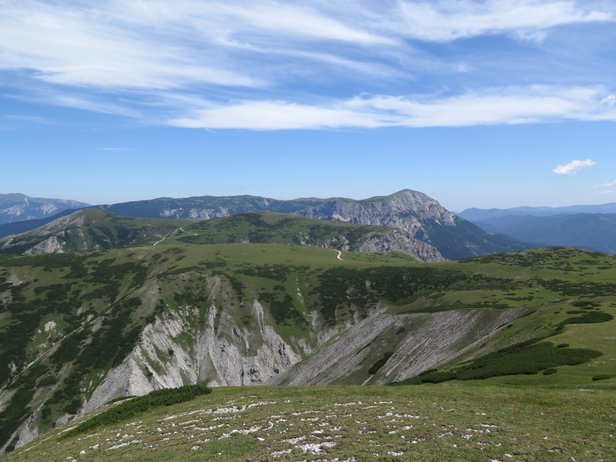Im Vordergrund links der Schusterstuhl (1875m), den ich als bequemen Ersatzgipfel auserkoren hatte, im Hintergrund die Gutensteiner Alpen und rechts Kuhschneeberg und Hochschneeberg.