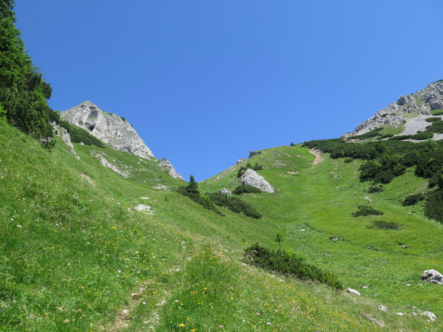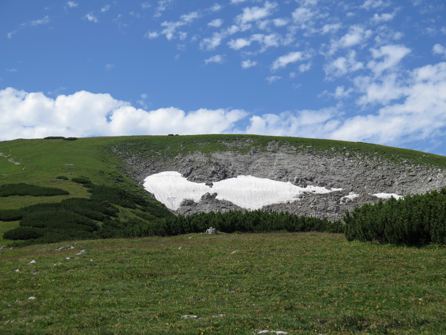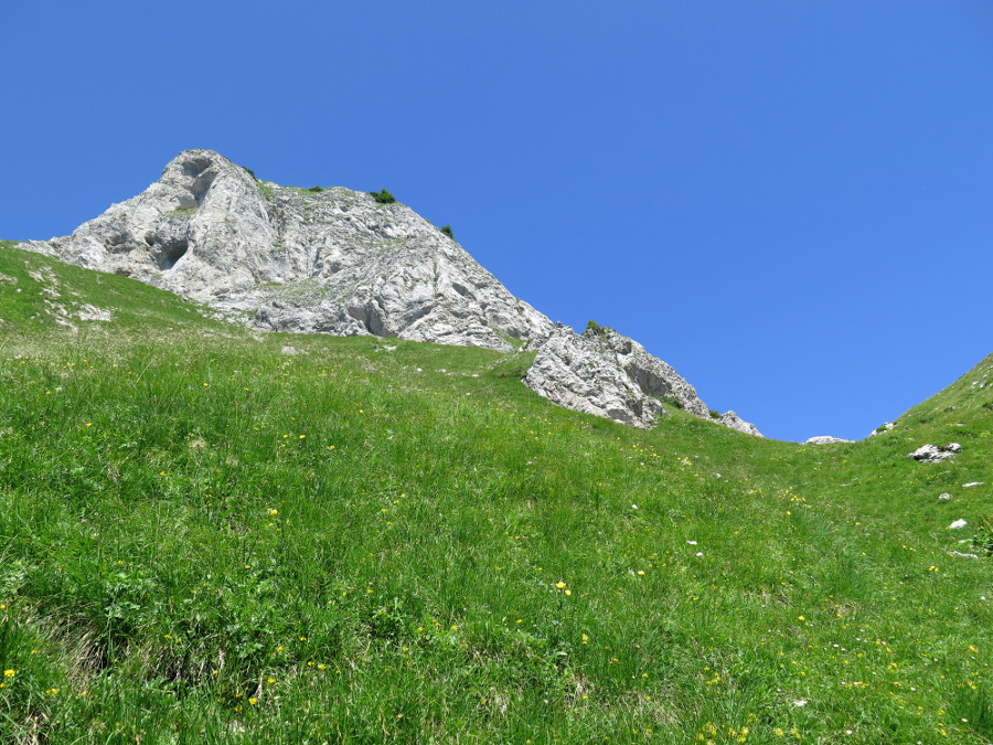 Der unmarkierte Steig führt im Schotter unterhalb der Felswände vorbei und dann von hinten bequem über eine Wiese zum höchsten Punkt.