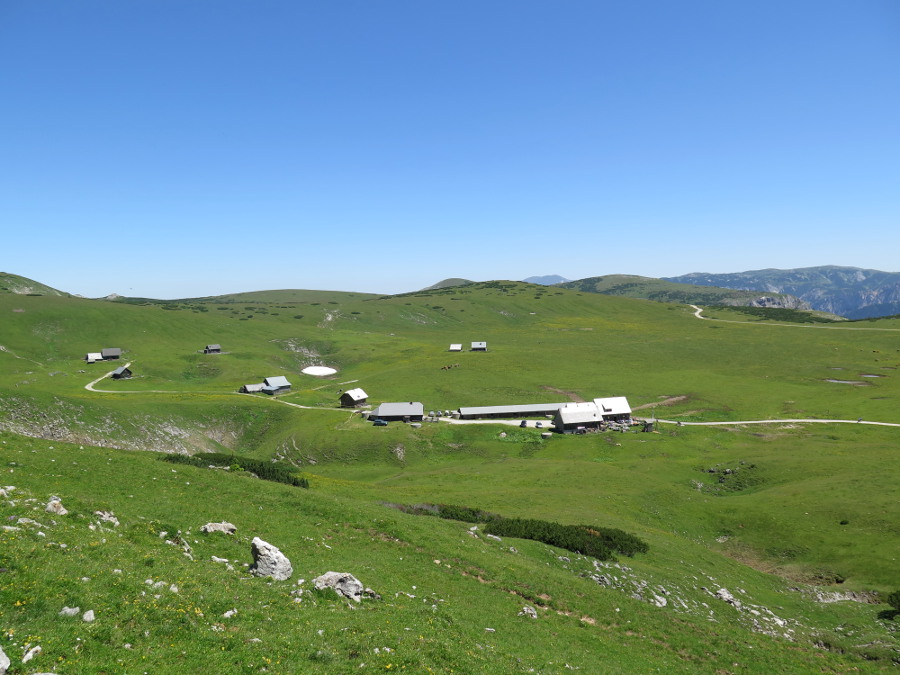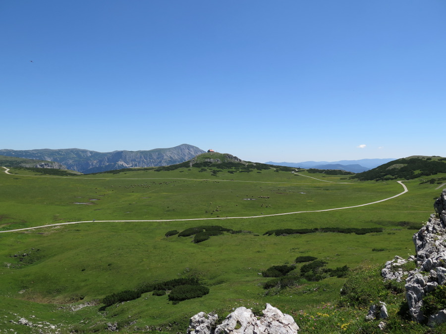 Riesige Weideflächen, dahinter idyllisch das Schneealpenhaus (1784m) und die Heukuppe.