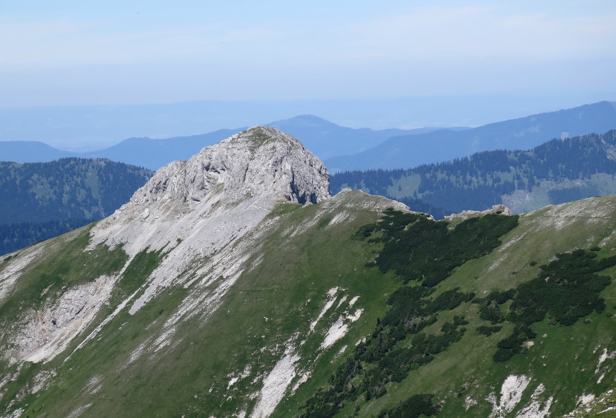 Rechts der Göller, im Vordergrund der wohl markanteste Gipfel der Schneealm, die Donnerwand (1799m). Diesen bezwang ich am nächsten Tag quasi in der Falllinie von Südwesten her.