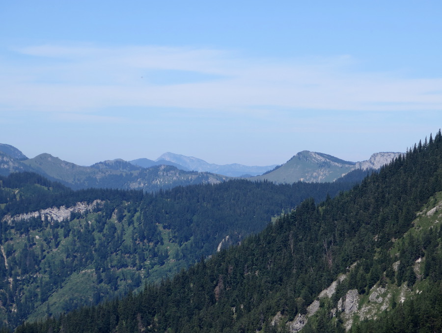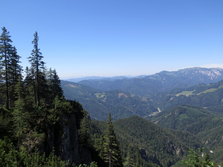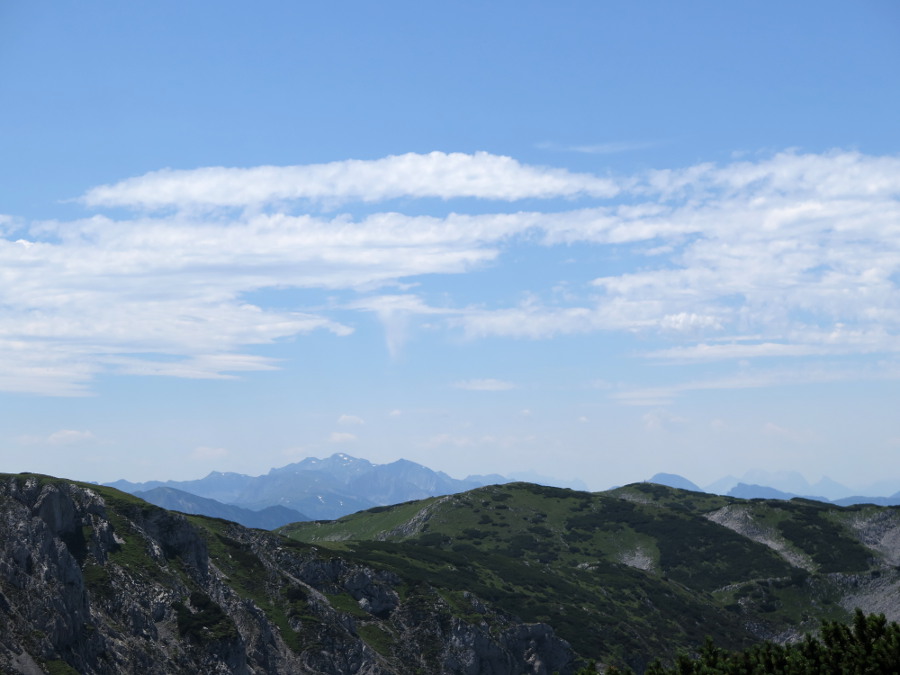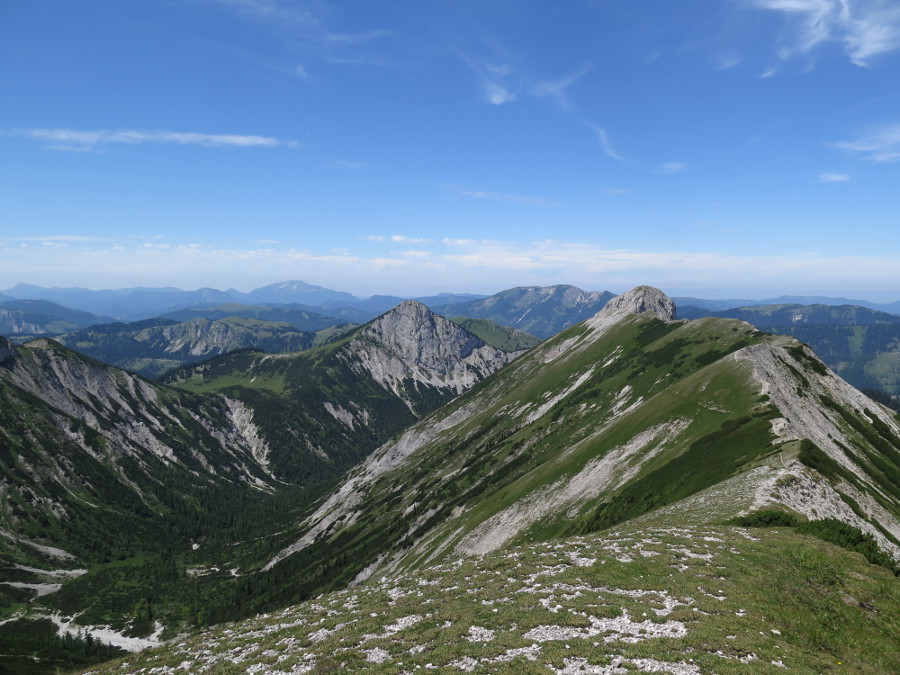 Hochschwabgipfel (2277m) und Hochweichsel (2006m) mit der Dreiecksfelswand sind unverkennbar, weiter rechts im Dunst Hochtor und Planspitze im Gesäuse, dann folgt die Riegerin und Hochtürnach, dahinter Tamischbachturm, Großer und Kleiner Buchstein.