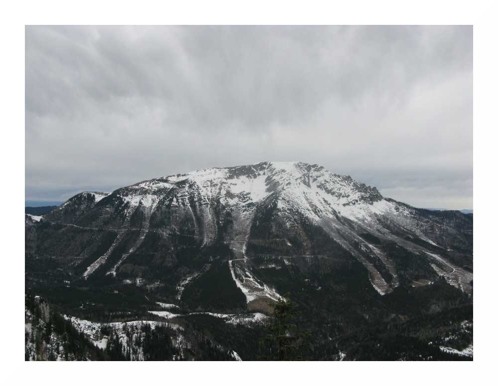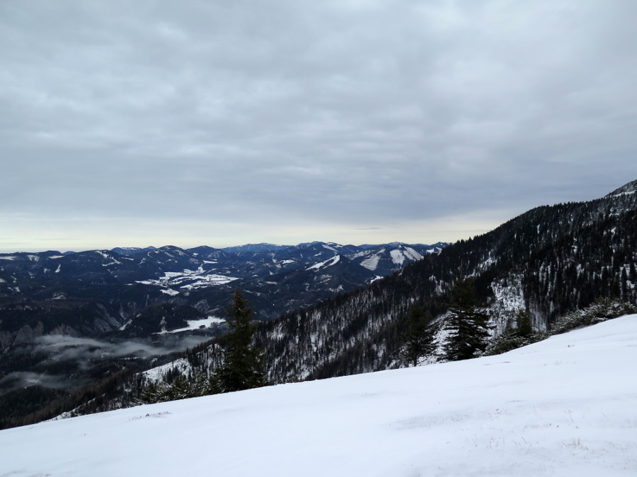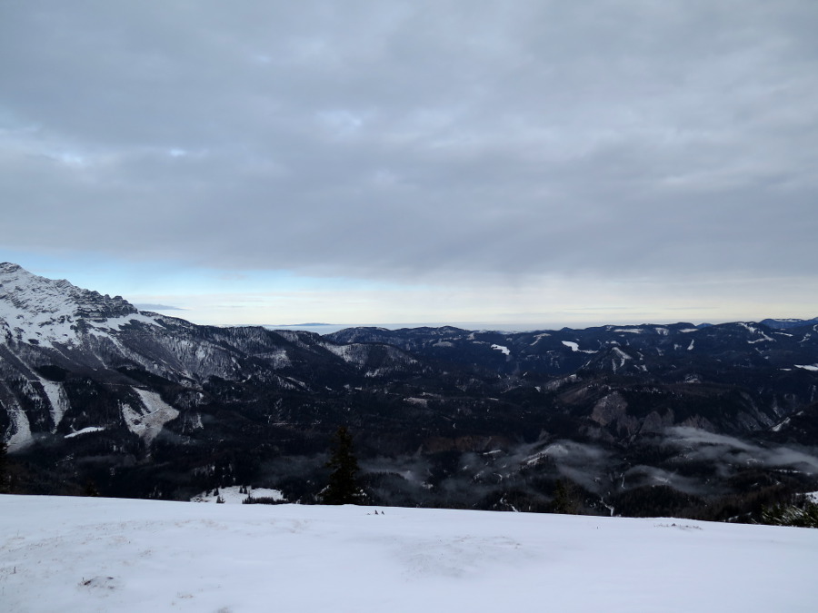 Rechts vom Rauhen Kamm ein Nebelmeer, am Ende das Waldviertel (ca. 80-90 km entfernt), in den Ötschergräben halten sich Nebelschwaden. Deutlich sieht man die Schneegrenze auf rund 1000 bis 1100 m.