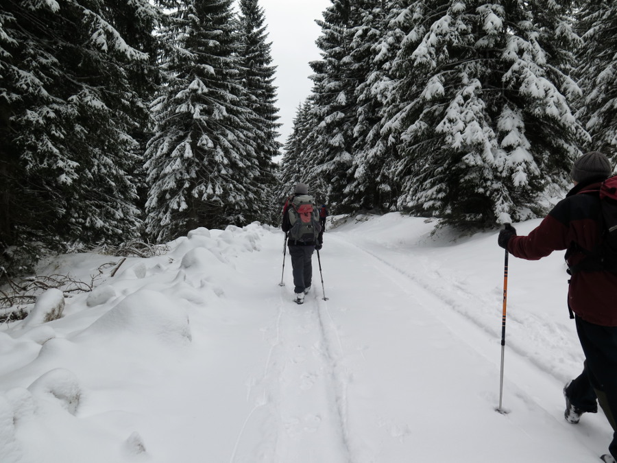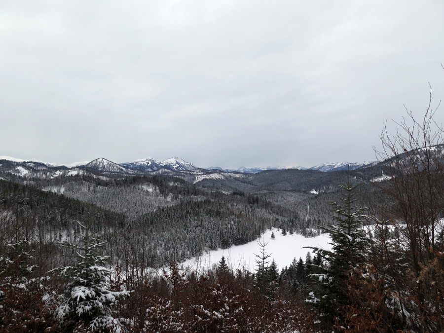 Unsere diesjährigen Schneeschuhwandertage im Mariazellerland standen unter keinem guten Stern. Der Dezember erwies sich als rekordwarm, extrem trocken und bescherte besonders den mittleren Lagen von 1000 bis 1500 m frostfreie Nächte und entsprechend austreibenden Pflanzen und Sträuchern (z.B. Haselnuss, Primeln, Schneerosen). Der einzig nennenswerte Neuschnee fiel Ende November, wobei sich nur in Schattenlagen oberhalb von etwa 1300 m eine geschlossene Schneedecke halten konnte. Mit dem Jahreswechsel war der Dezemberfrühling dann vorbei, mehrere schwache Fronten brachten bis in die Niederungen Neuschnee. Doch wie viel war wirklich gefallen? In den von uns angestrebten Wanderregionen gibt es leider kaum Schneepegel, Niederalpl und Zellerrain meldeten dürftige 10-15 cm. Ob das reichen würde? Wir nahmen vorsichtshalber die Grödeln und Steigeisen mit, doch Reini entschied am Vortag noch, dass wir die Schneeschuhe trotzdem mitnehmen sollen. Im Nachhinein eine goldrichtige Entscheidung!