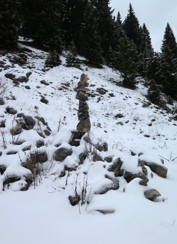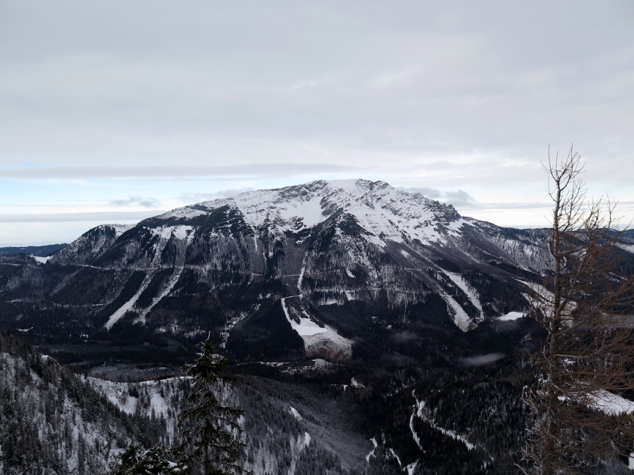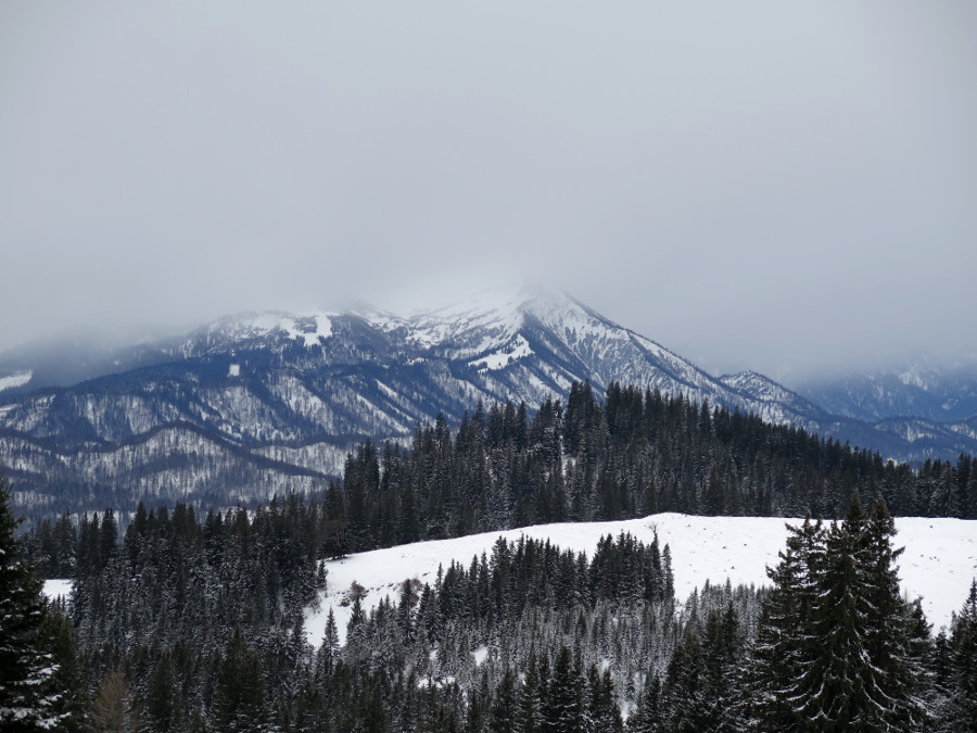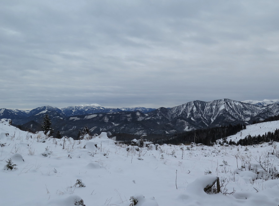 Die erste Tour führte in bekanntes Gelände. Weil Roland und ich mit dem direkten Bus nach Mariazell anreisten und zur Weiterfahrt nach Fallenstein ein Taxi benötigt hätten, kamen uns die anderen entgegen und nahmen uns mit zum Zellerrain. Von dort gingen wir auf die Breinmauer (bzw. Breimauer, beide Schreibweisen möglich). Zum Vergleich: Die nahezu identische Tour am 4. Jänner 2014 bei sogar recht ähnlicher Wolkenbedeckung.