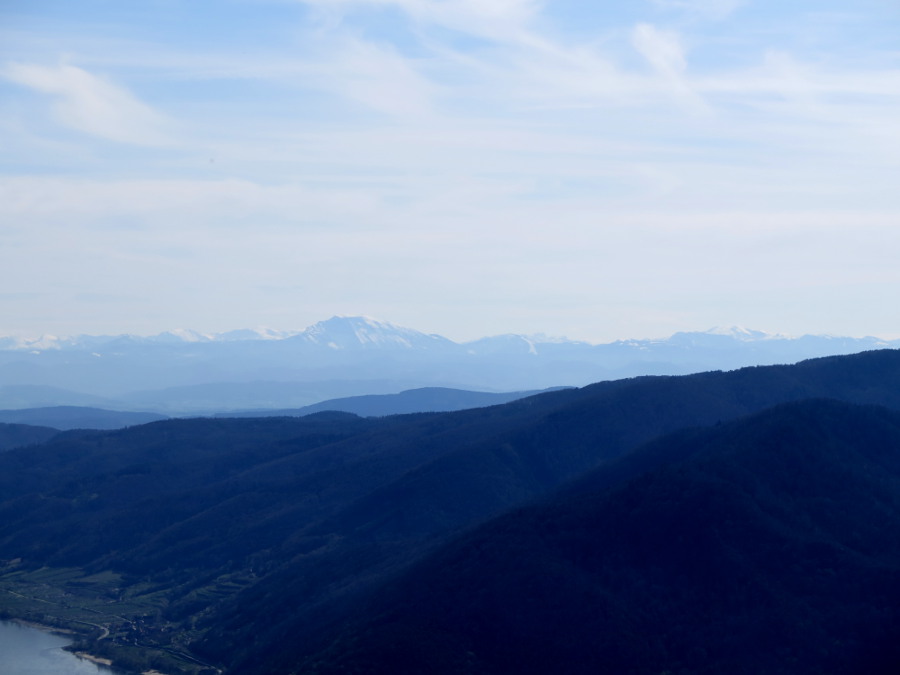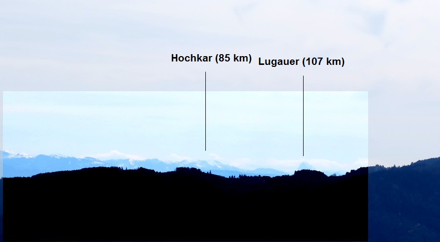 Der Ötscher dominiert das Panorama, links davon Hochschwab-Gipfel (89 km entfernt), nochmal links Ringkamp (2153m); weiter rechts schaut der markante Zacken des Ebenstein (2123m, 92 km) drüber, ganz rechts der Dürrenstein (1878m).