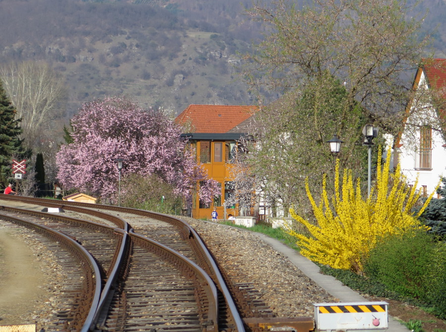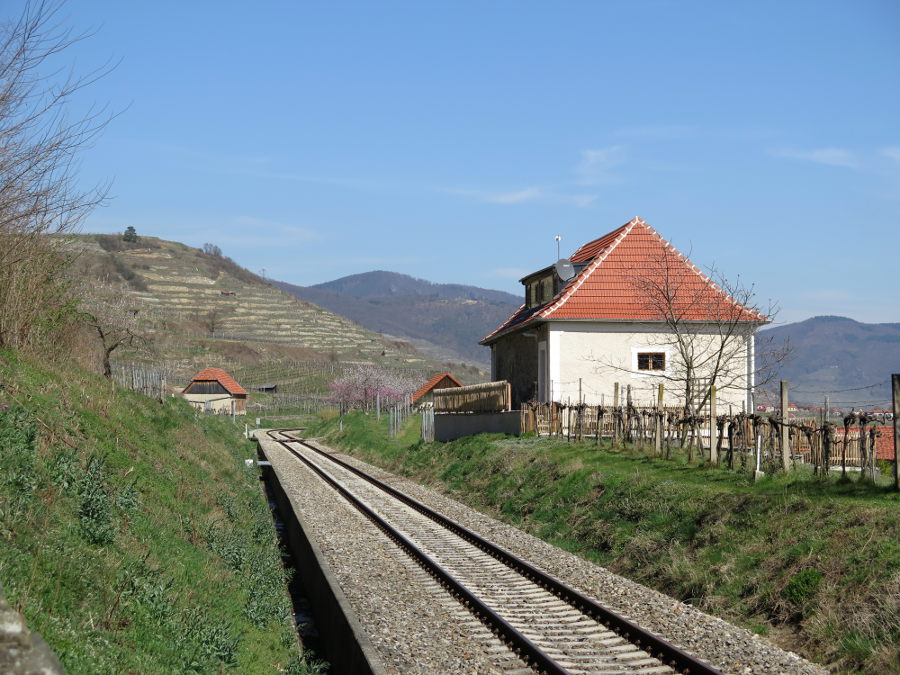 Bild 2: Der Steig quert die Gleise der Wachauer Bahn, im Hintergrund Sandl (723m)