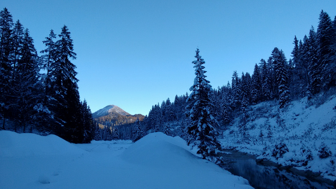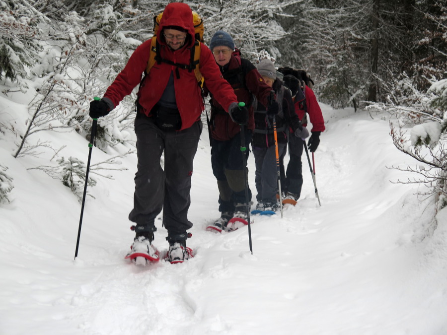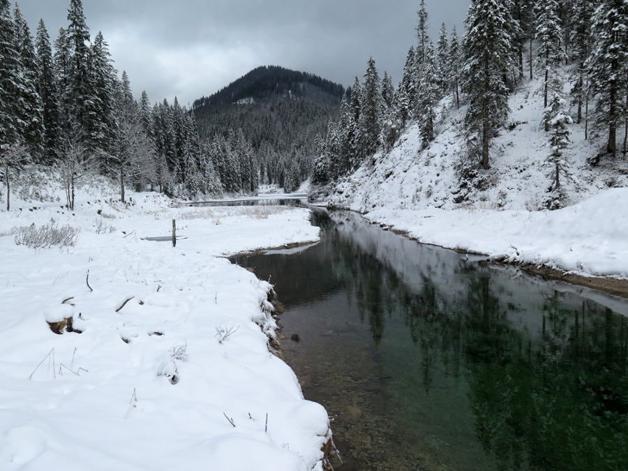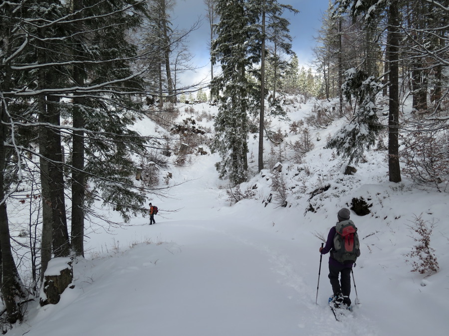 Wir konnten also zu Beginn an die Schneeschuhe aufschnallen, als wir den Faltbach entlang hineingingen.