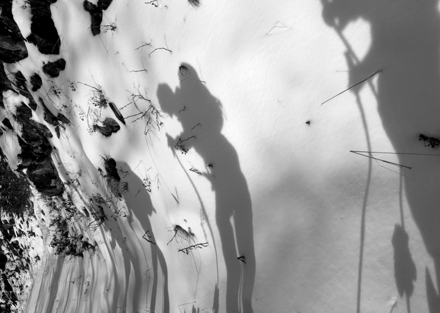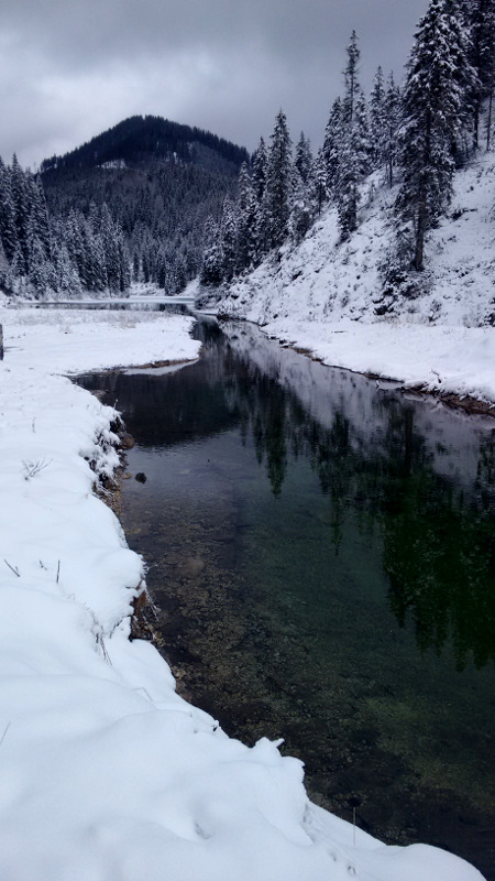 Mit meinem Infrarotthermometer maß ich am Standort zwischen -6 und -8 Grad, auf der schattigen Wiese ganz rechts des Bachs eisige -14 Grad.