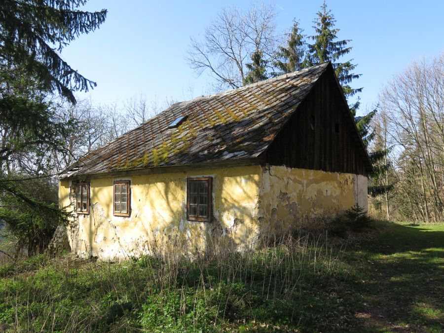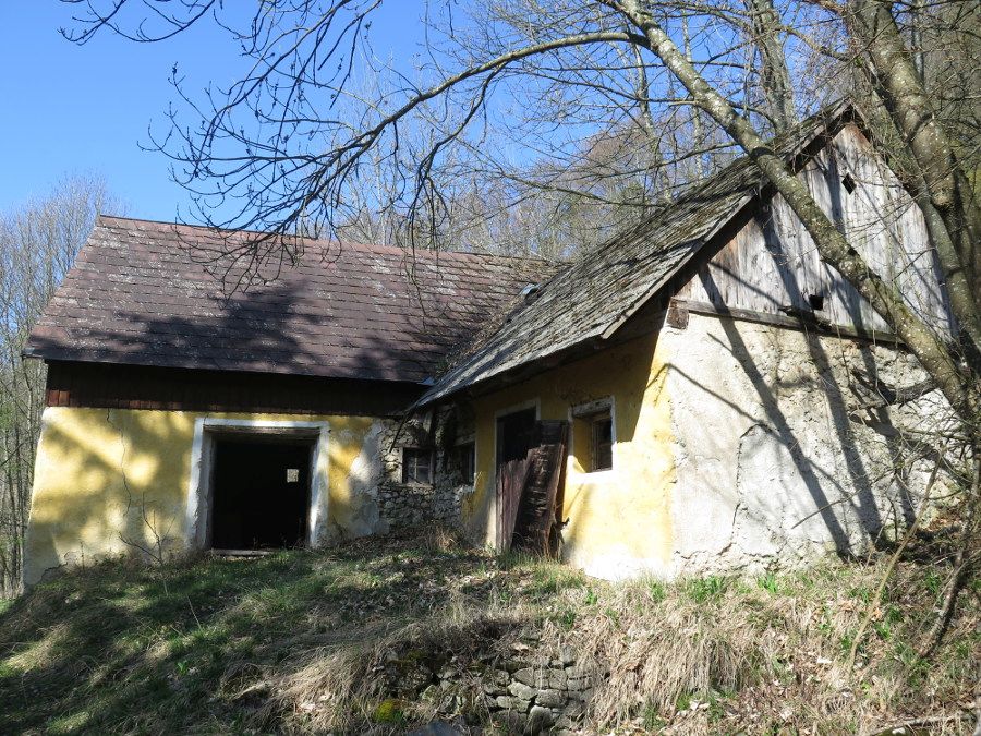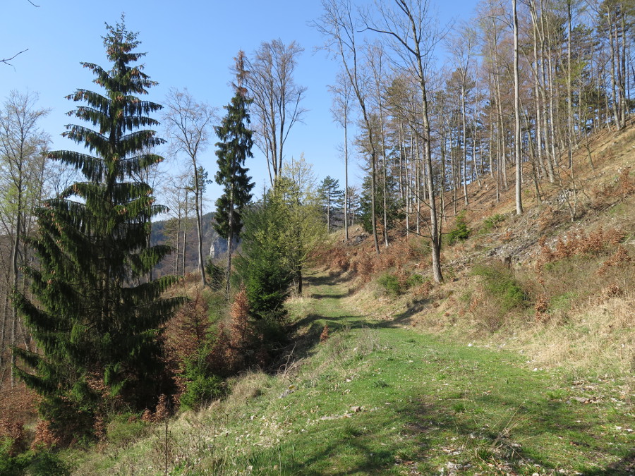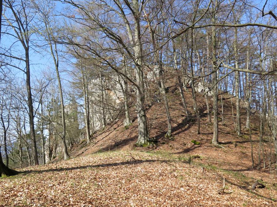 Ab hier gehe ich weglos, mit GPS in etwa einer (kaum erkennbaren) Steigspur folgend Richtung markiertem Weg nach Pottenstein. Etwa auf halber Strecke kommt ein schwach ausgeprägter "Gratrücken" rechts von mir, laut AMAP sollte er links von mir sein. Ich gehe weiter rechts und stoße auf einen mit Laub gefüllten Graben, der eigentliche Weg also, kaum besser begehbar. Er endet bei einer Wildfütterungsstelle und bald darauf am markierten Weg.