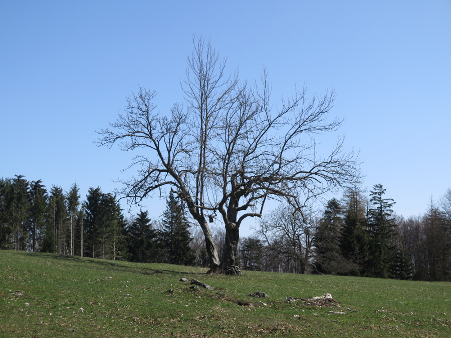 Wanderfreund Wolfgang hat diesen Baum Anfang Februar ebenfalls fotografiert. Er ist an sich auch das einzig lohnenswerte Motiv, denn von diesem Gipfel hat man keine Aussicht. Die seit 1924 bestehende Berndorfer Hütte ist 2007 abgebrannt und seitdem gibt es hier oben nichts mehr außer Ruhe und Sonne.
