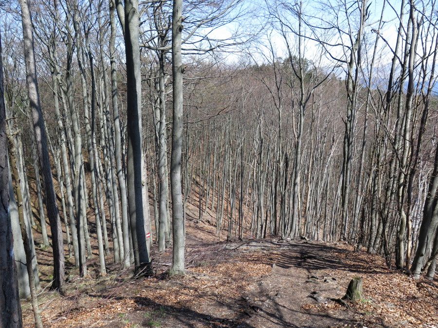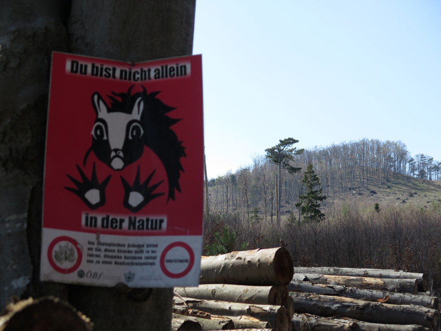 Ich starte bei Sonnenschein und angenehm kühler Luft an der Haltestelle Ortmann, wo ich als einziger aussteige. In Wien hielten sich noch kompakte tiefe Wolken, wie es die Wettermodelle vorausgesehen hatten. Wiener Neustadt war bereits fast wolkenlos. Die ersten Meter windet sich der gut markierte Steig steil hinauf, dann folgt eine längere, ansteigende Querung bis zu einem Forstweg.