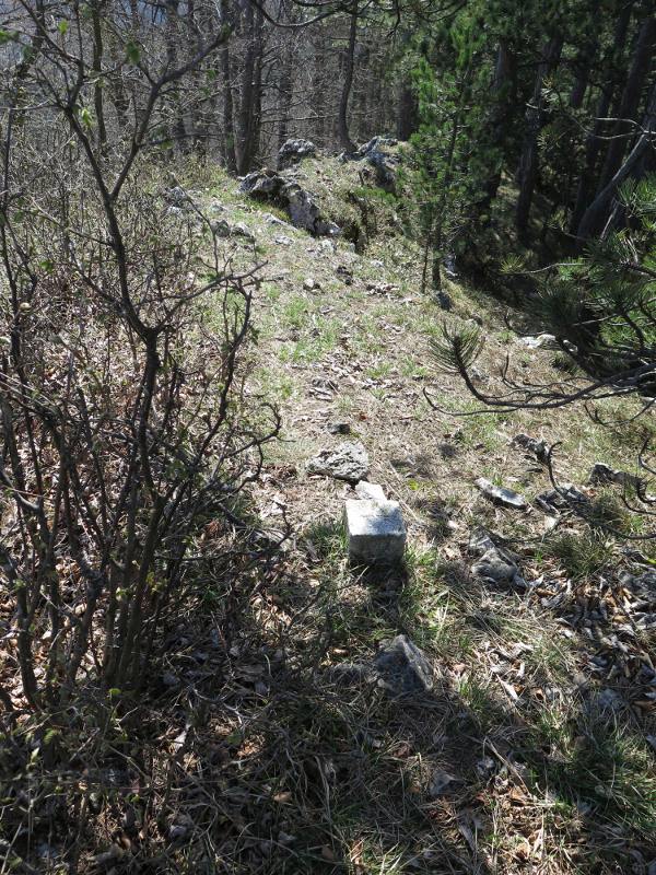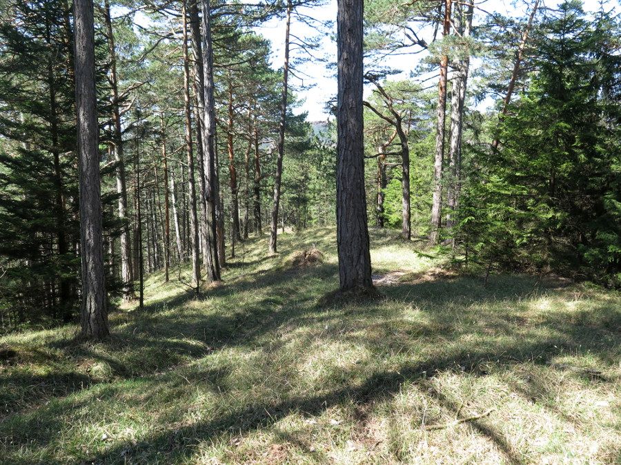 Nach der Sonnenrast setze ich meinen Weg auf den Steigspuren fort, die allerdings kurz darauf in die linke (westliche) Flanke des Berges führen, also gehe ich weglos auf den Kamm, wo sich wieder undeutliche Steigspuren finden.