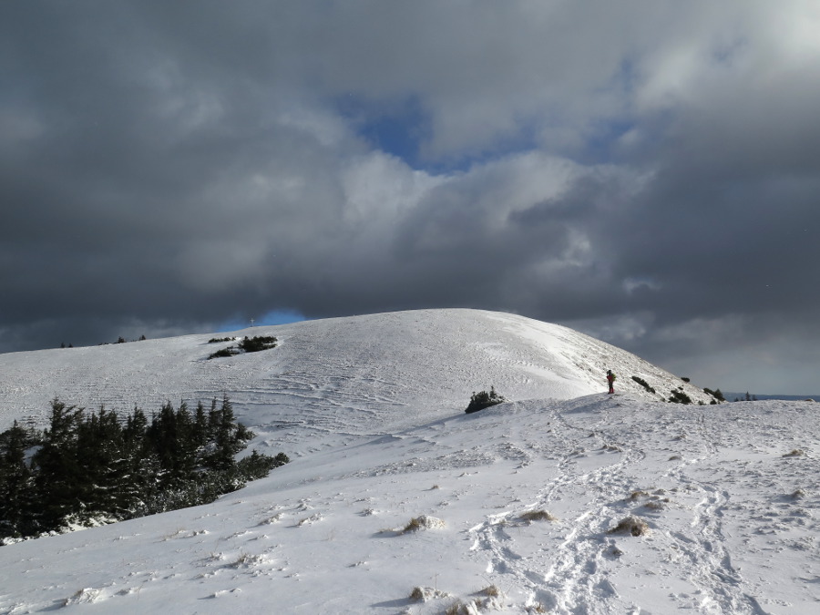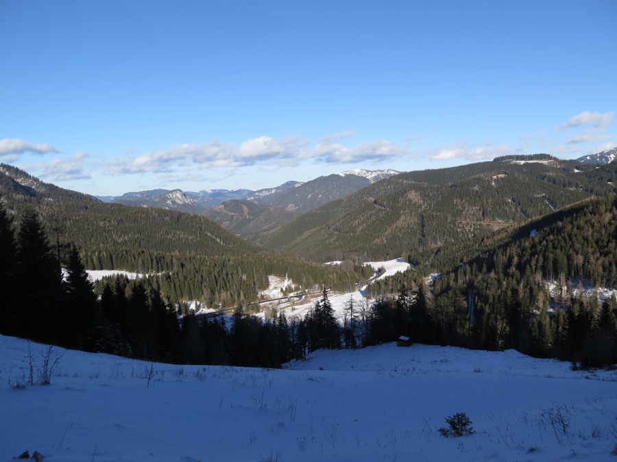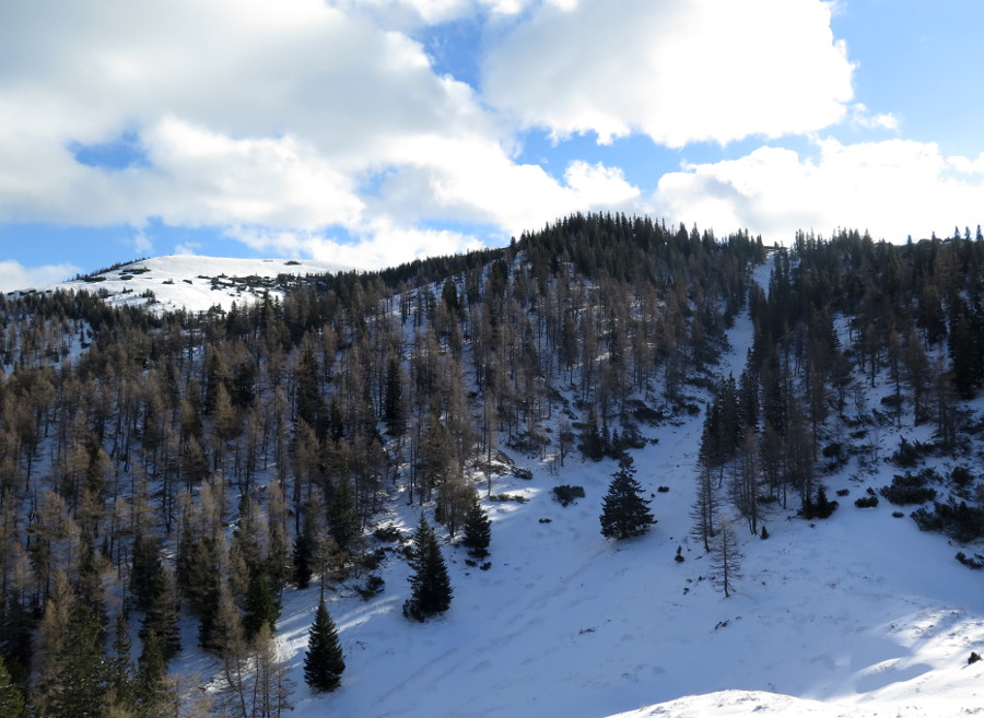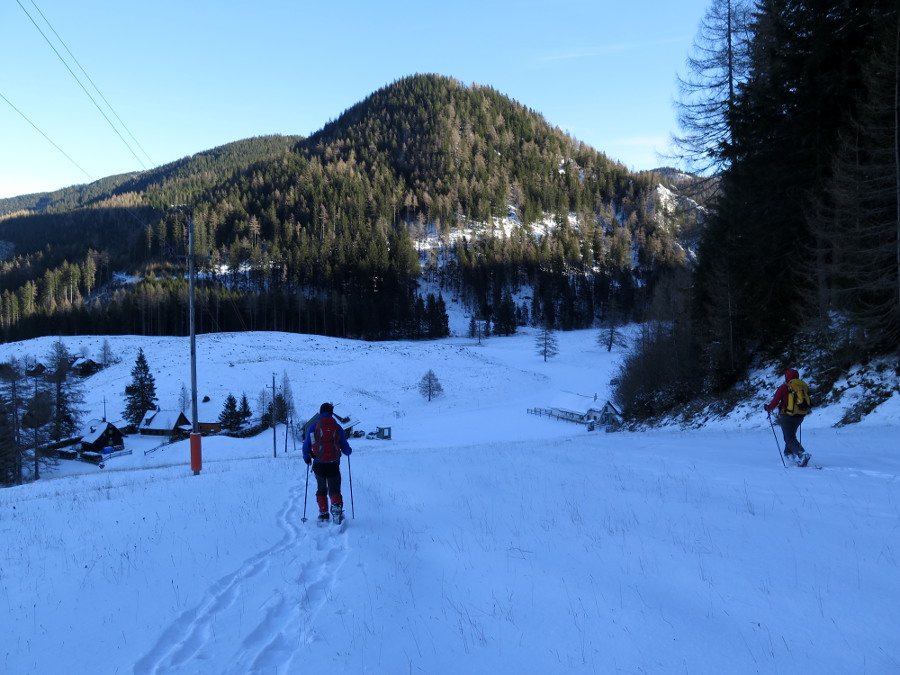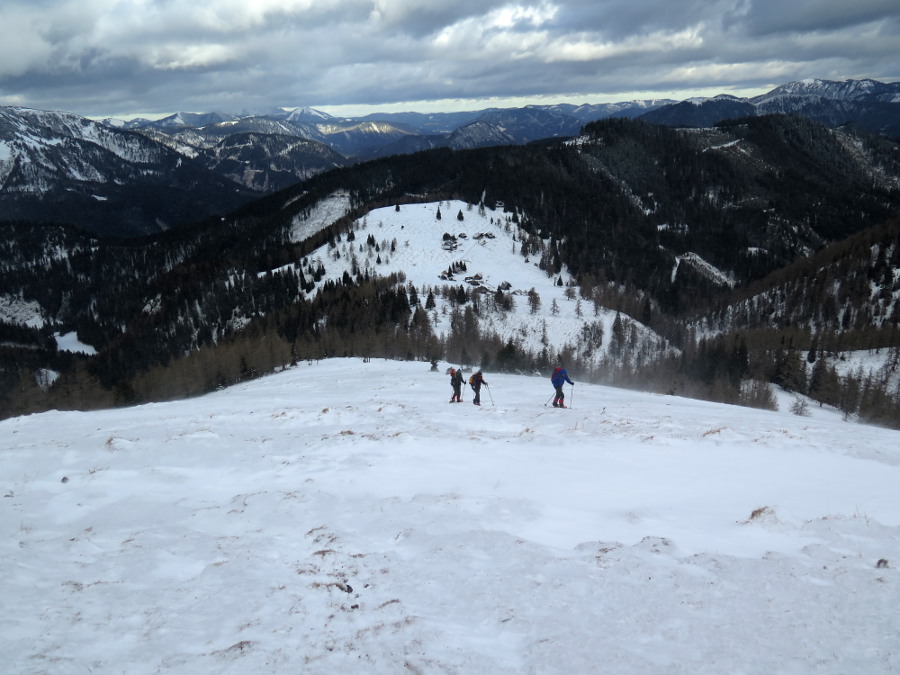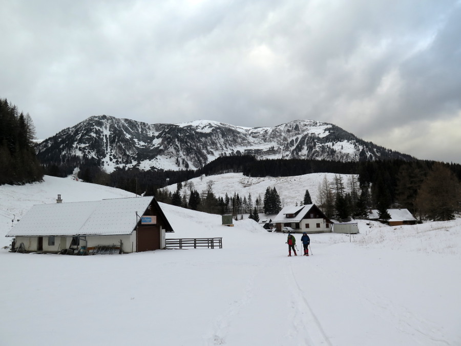 Gewöhnlich zählte der Seebergsattel einmal zu den schneesichersten Gebieten der Voralpen, doch dieses Jahr ist alles anders. Wir starten an der Seebergalm, alle Lifte stehen still, wodurch wir später gratis und ohne auf Skifahrer Rücksicht nehmen zu müssen die Skipiste zum Abstieg benützen können.