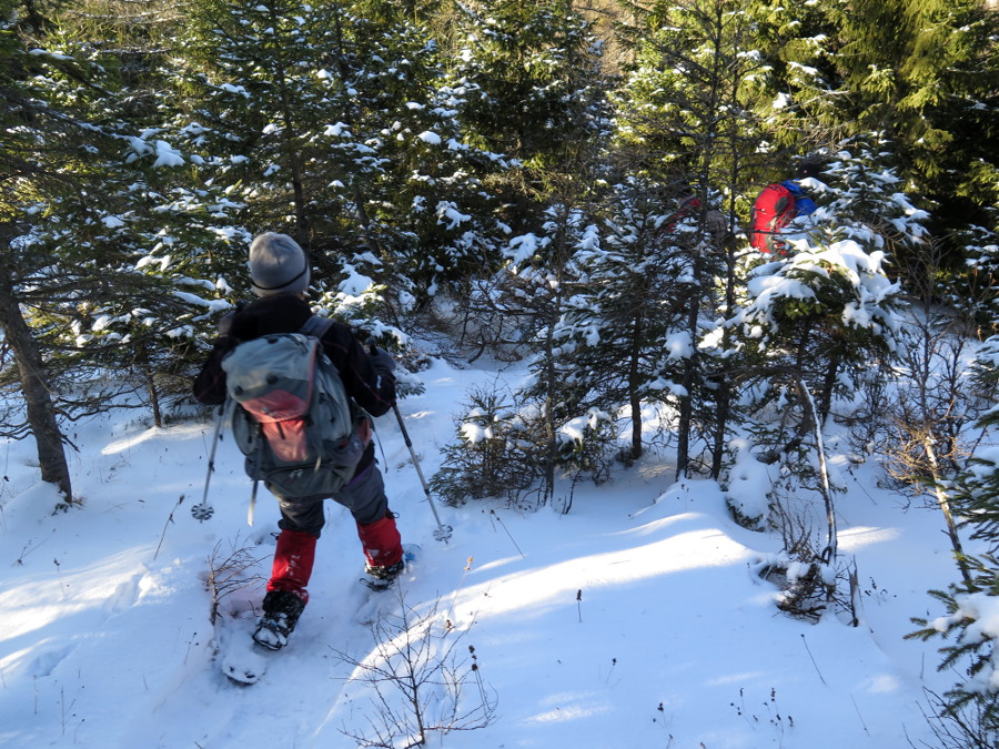 Bild 15: Dieses Mal wählen wir nicht die steile Skipiste vor uns, sondern steigen gemächlicher, dafür mit genügend Schnee ab.