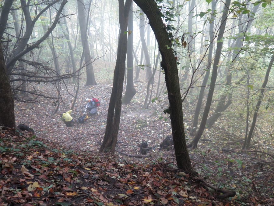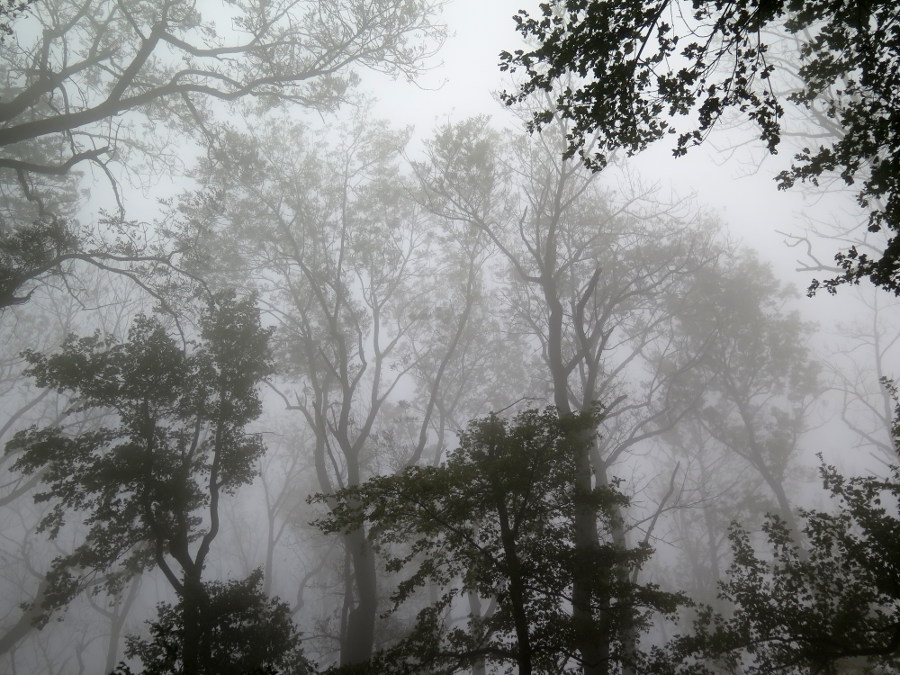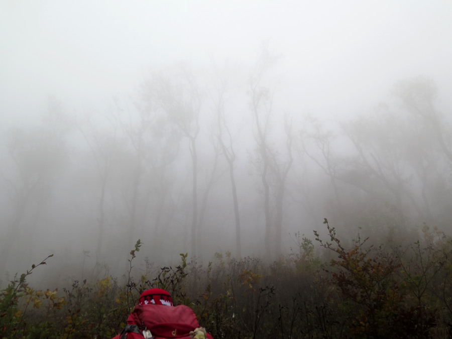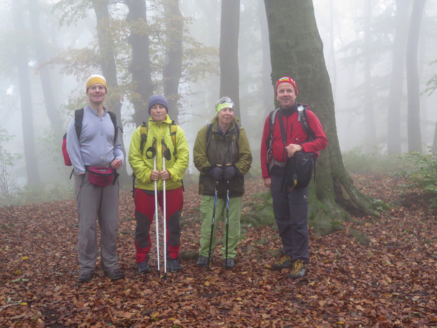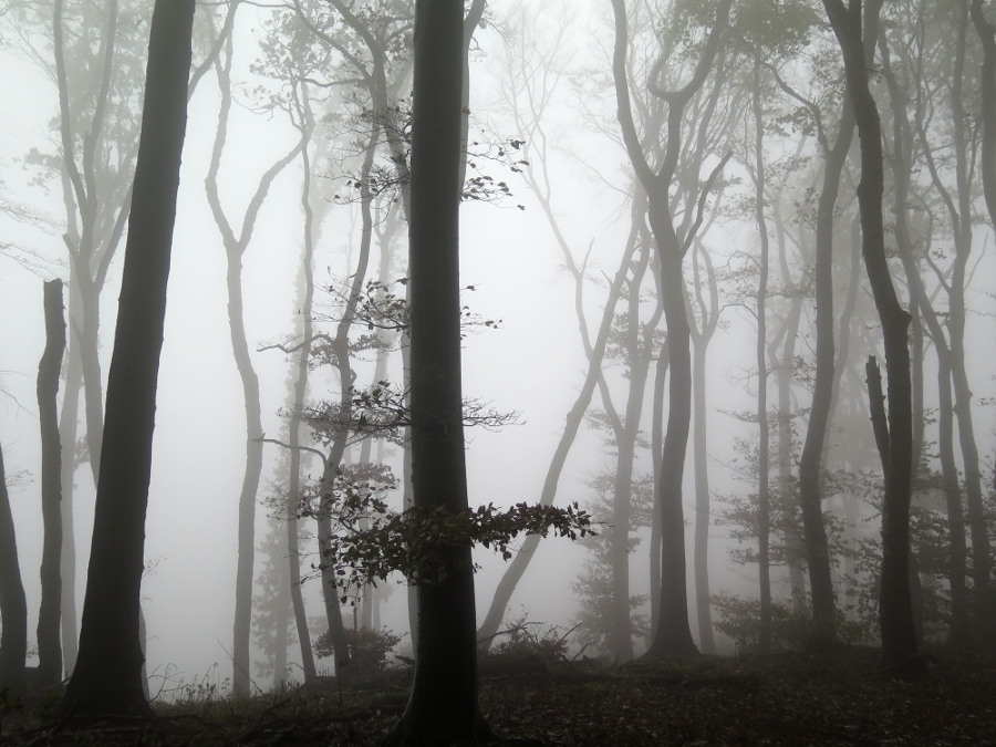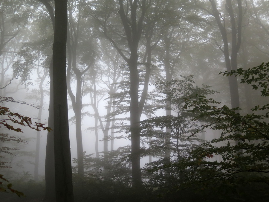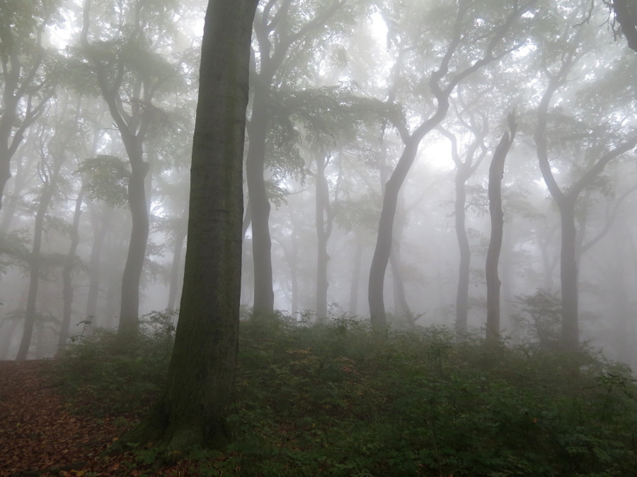 Bild 14: Nach mühsam-rutschig-dorniger Botanikruachlerei tauchen die Buchen des Vogelsangbergs aus dem Nebel auf.