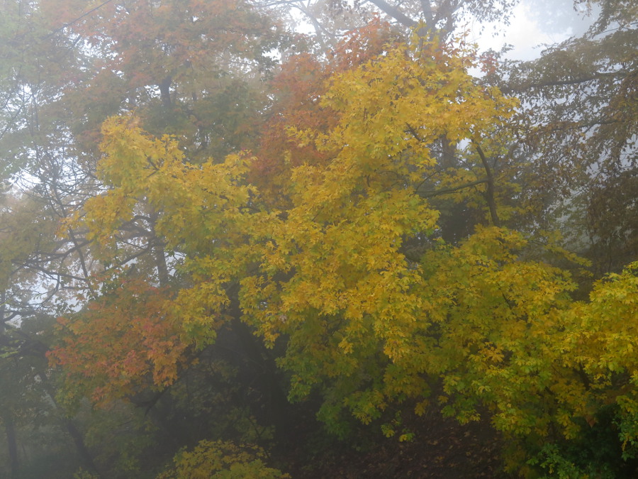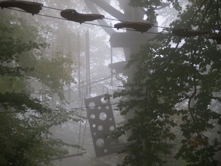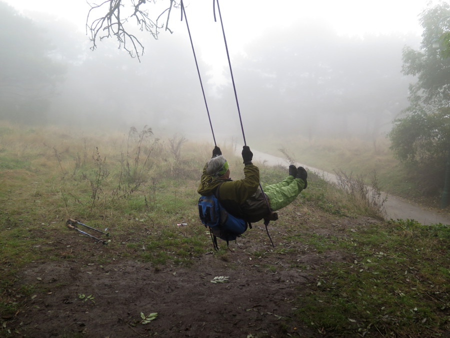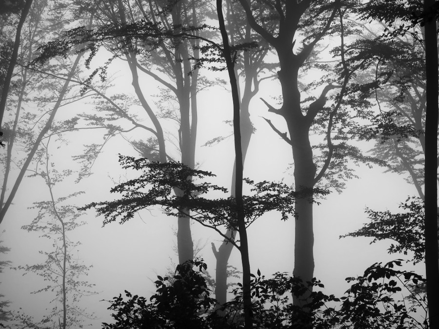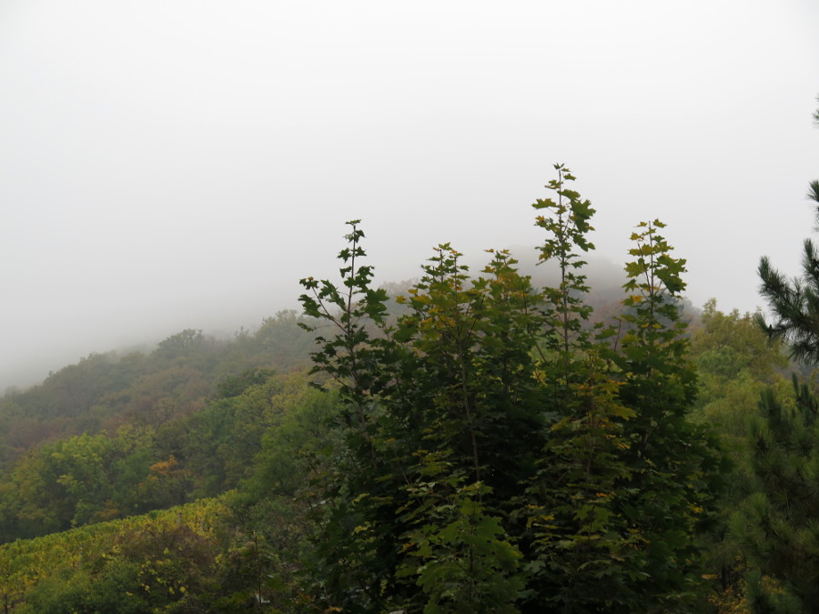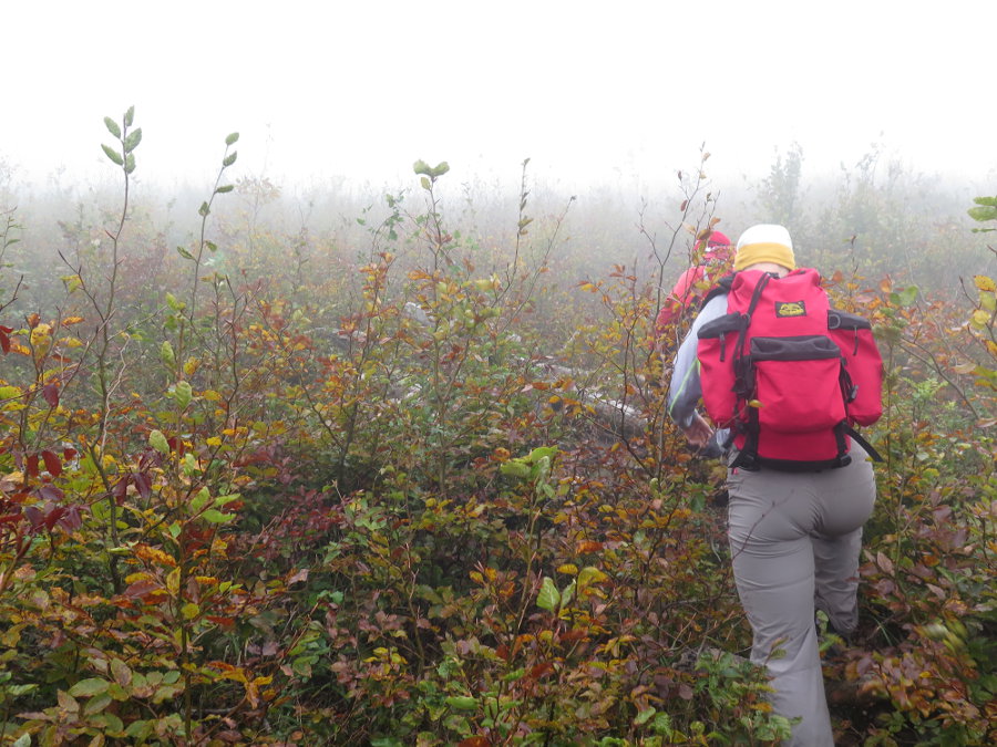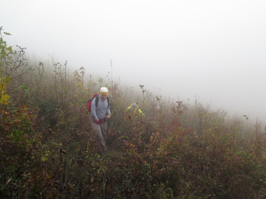 Bild 14: Nach mühsam-rutschig-dorniger Botanikruachlerei tauchen die Buchen des Vogelsangbergs aus dem Nebel auf.