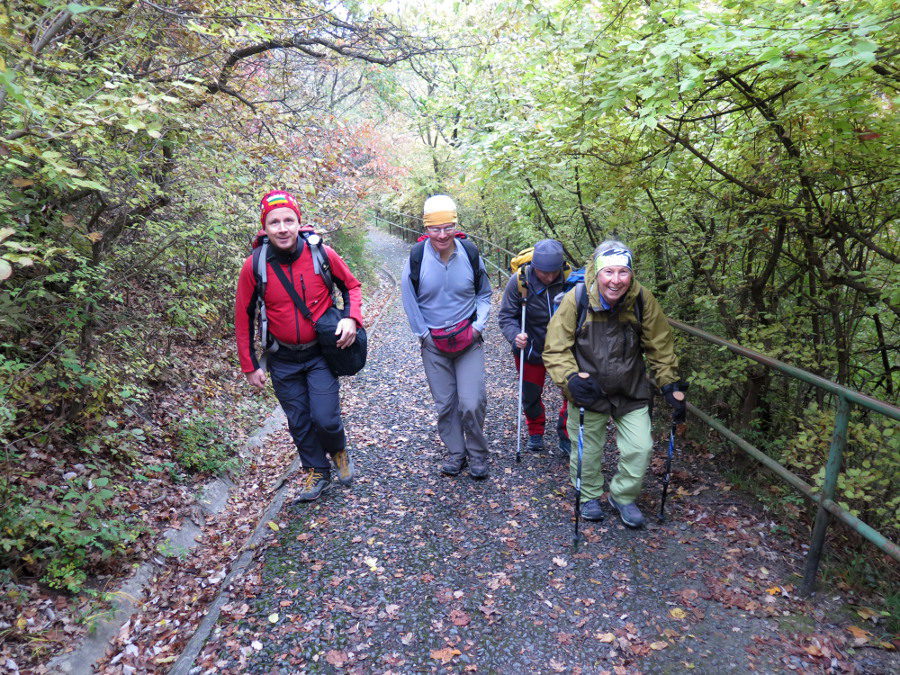 Danach folgt eine Einkehr beim Grüß di Gott -Wirtn, der sichtlich mit der Masse an Besuchern überfordert ist. So warten wir gut eine Stunde auf unser Essen, andere stehen entnervt auf, weil sie nicht bedient werden. Das Essen ist aber vorzüglich und so voll hab ichs noch nie erlebt. Zwei weitere Moderatoren gesellen sich zu uns. Als wir um halb fünf wieder ins Tageslicht treten, ist der Hochnebel von Osten her aufgerissen. Nach einem weiteren schönen, mir bis dahin nicht bekanntem Weg zum Beginn der Zierleiten (typisch tief eingeschnittener Wienerwaldgraben) ...