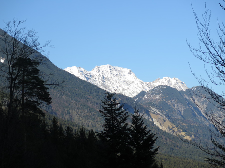 Dahinter links Achselkopf (1560m9, Brandjochkreuz (2268m), Hohe Warte (2597m) und Hintere (2599m) und Vordere (2559m) Brandjochspitze.