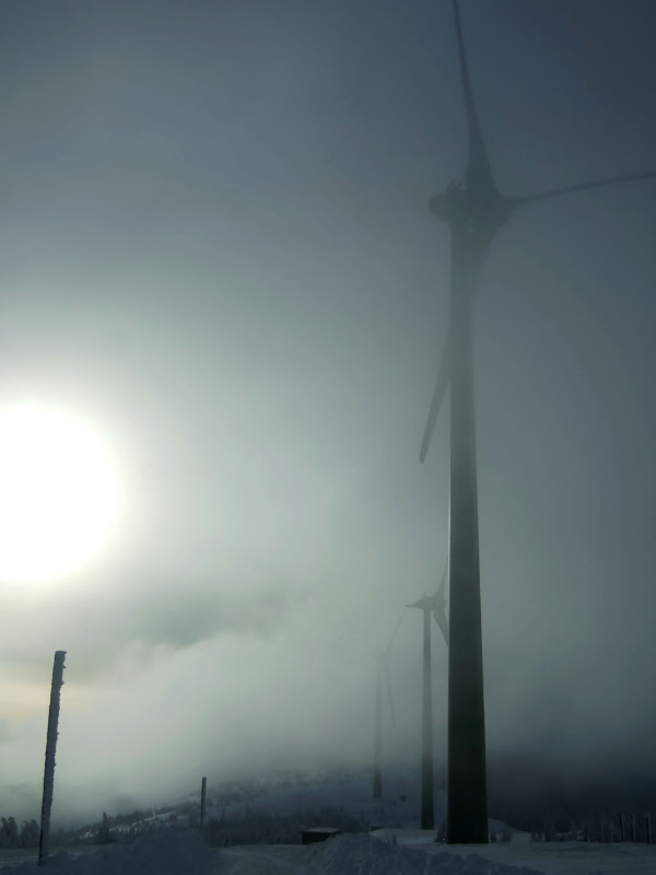 Dahinter ist der Bau des Windparks auf der Pretulalpe offensichtlich fortgeschritten (Fertigstellung Anfang 2017) und der ehemals schöne Pfad am Kamm ist einer breiten Forststraße gewichen. Zwar dämpfte das ein wenig der Schönheit der Umgebung, andererseits kamen wir so zügiger voran, was aufgrund des starken Windes durchaus willkommen war. Gefährlich ist dieser Wegabschnitt jedoch trotzdem, insbesondere durch die Windräder rechts vom Weg, wenn der Wind bei dieser Gehrichtung aus Nordwesten kommt. Auf den riesigen Rotorblättern befanden sich immer wieder mächtige Eisbrocken, die gelegentlich abbrachen. Getroffen werden sollte man davon lieber nicht.