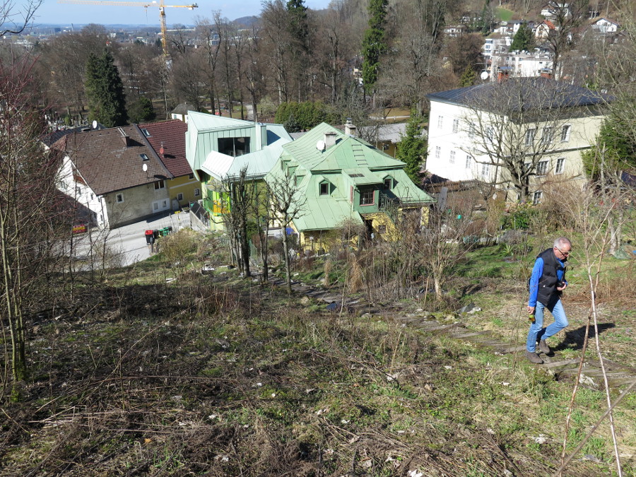 Wir kehrten dann auf der Gersbergeralm ein, wo sich zufällig ein Landsmann von mir gegenüber setzte, ein Aschaffenburger, der auch schon länger in Österreich gearbeitet hat. Nach gutem Essen fuhren wir mit dem Bus zum Mirabellenplatz zurück. Ich hatschte dann über die Altstadt auf direktem Wege zur höchsten Erhebung des Mönchsbergs, der Richterhöhe (507m).