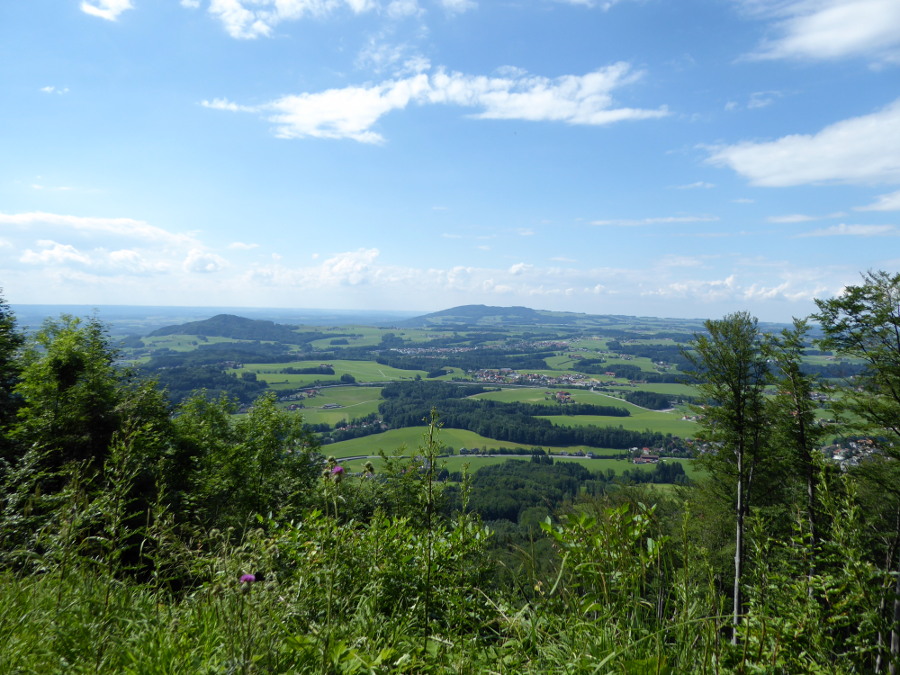 Bild 11: Zum Abstieg wähle ich den Forstweg an der Nordflanke mit Aussicht zu Hochgitzen und Haunsberg und weit ins bayrische Alpenvorland hinein.
