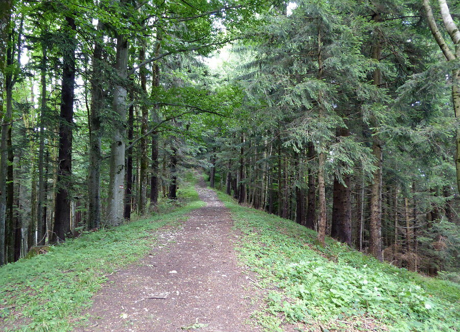 Bild 8: Schöner Kammweg, der oben schmäler und überwucherter wird, mit dem Vorteil von den ersten reifen Himbeeren direkt zum Abpflücken neben dem Weg.