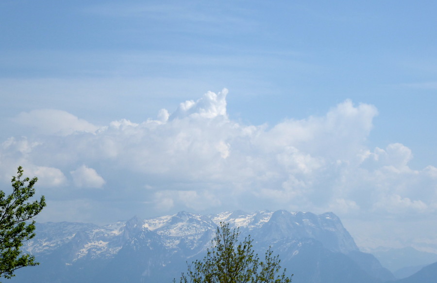 Bild 5: Größere Quellwolken südlich vom Tennengebirge, teils das Vereisungsstadium erreichend (Cumulonimbus capillatus).