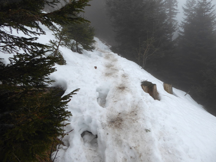 Bis zum Forstweg sind alle Schneereste weggeschmolzen, auch die ersten Serpentinen sind inzwischen komplett schneefrei. Erst ab ca. 1200m Höhe, also die letzten 3-4 Kehren liegt noch stark dezimierter Altschnee. Dank Tritten und Erdbodendreck (Erde, Nadeln, kleine Äste) aber guter Grip und keine Eisen notwendig.