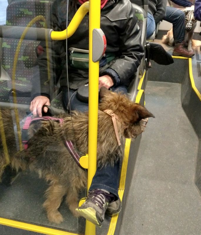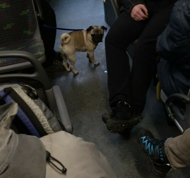 Ganz hinten eine Frau mit sehr entspanntem Australian Shepherd mit Maulkorb, in der Mitte, ebenfalls mit Maulkorb, sowas ähnliches wie Steirische Rauhhaarbracke, und dann stieg ein Mann mit einem ängstlichen Mops zu und blieb gleich vorne, als er die beiden anderen Hunde sah "der fürchtet sich". Dann gings los. Die beiden mit Maulkorb schauten sich immer wieder an, dazu ein heulender Klagton von der Bracke. Der Mops fing immer wieder an zu kläffen, sprang zwischendrin am Besitzer hoch mit einer Art vorwurfsvollem Blick, und kläffte dann weiter Richtung Bracke, der den Mops scheinbar ignorierte. Der Mops hörte aber nicht auf, die Bracke surrte und der Shepherd schaute nur ruhig zu. Allgemeine Heiterkeit im Bus, regelrechtes in Lachtränen ausbrechen, bis der Mops (und ich) an der Gersbergalm ausstiegen. "Bist schon ein Unterhaltungskünstler!" sagte das Herrchen.