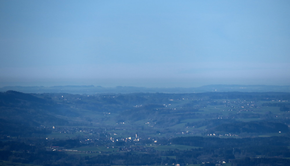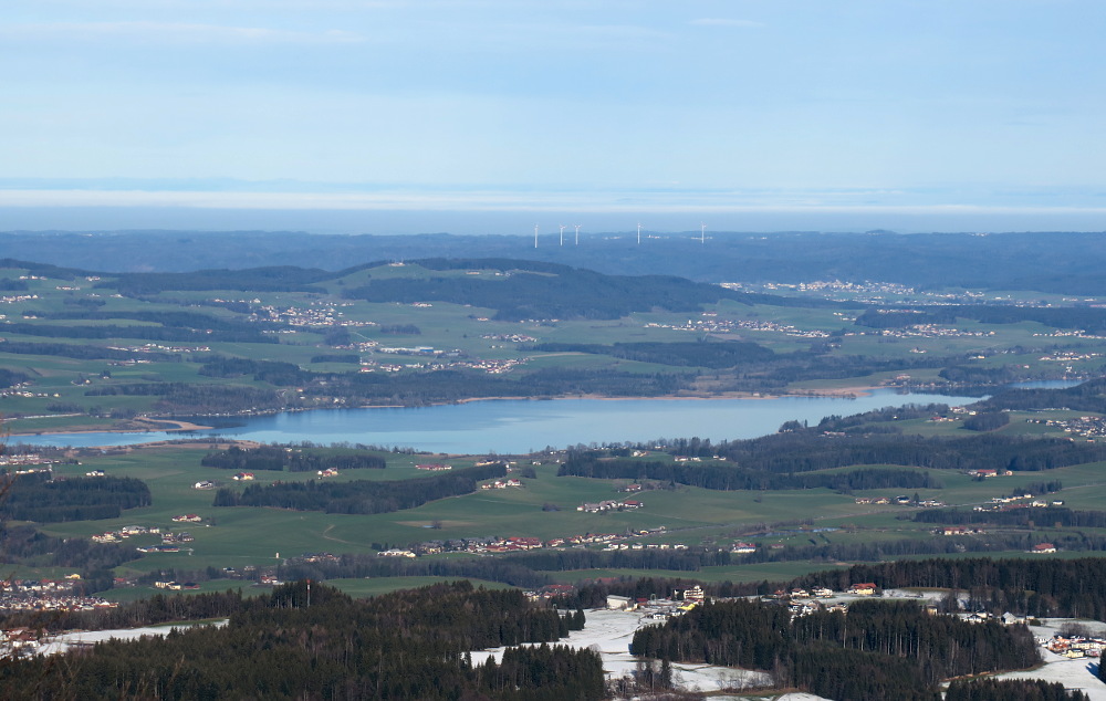 Bild 16: Tannberg und Wallersee, dahinter Windpark Munderfing und Hochnebel im Donautal.