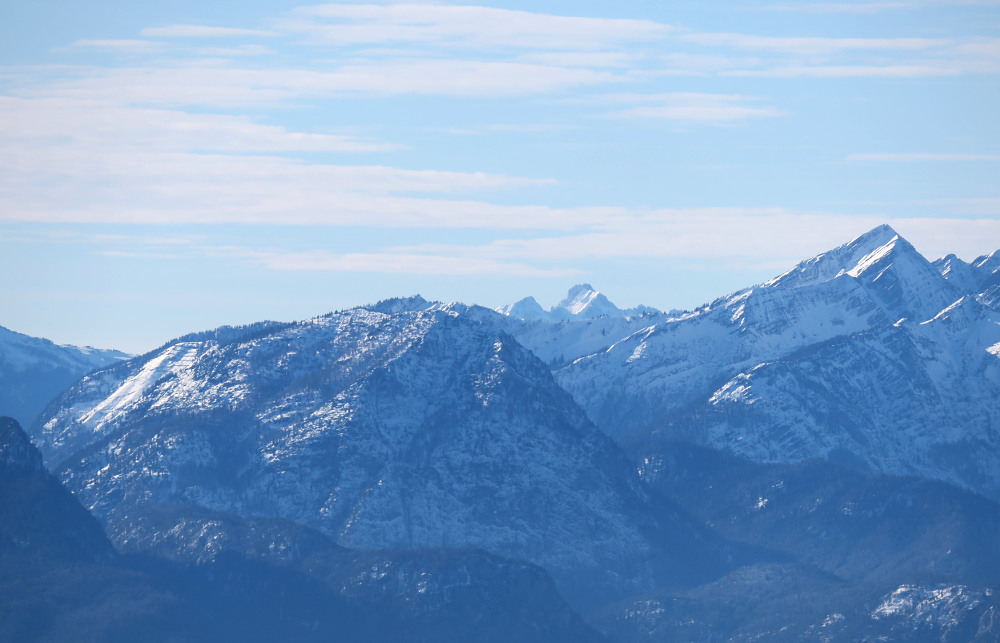 Bild 19: Über der Loferer Alm (rechts Steinplatte) schaut der Große Beil (2309m) in 96km hervor.