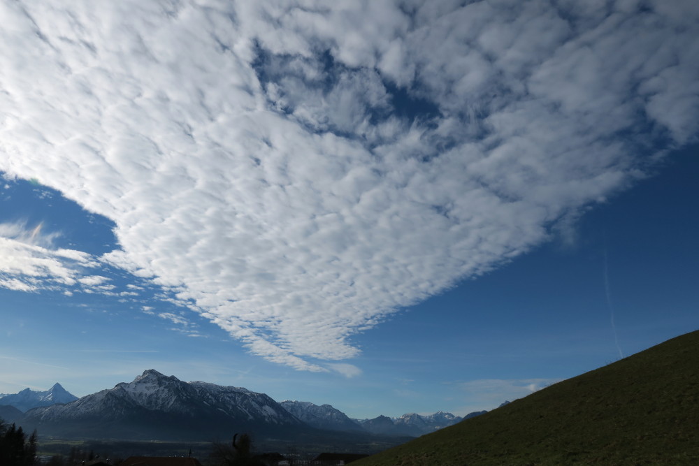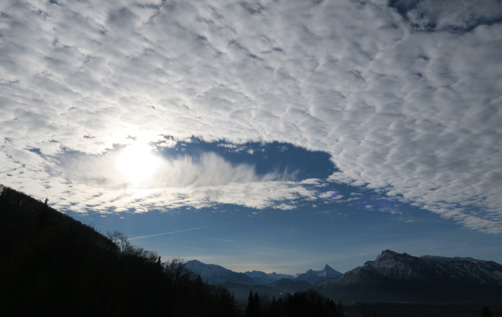 Durch Eiskeime, die Kondensstreifen von Flugzeuge in der Höhe eingebracht haben, werden die mittelhohen Wolken ausgefällt, die Fallstreifen sind gut im Bereich der Sonne zu sehen. Der Altocumulus bekommt dadurch Lücken.