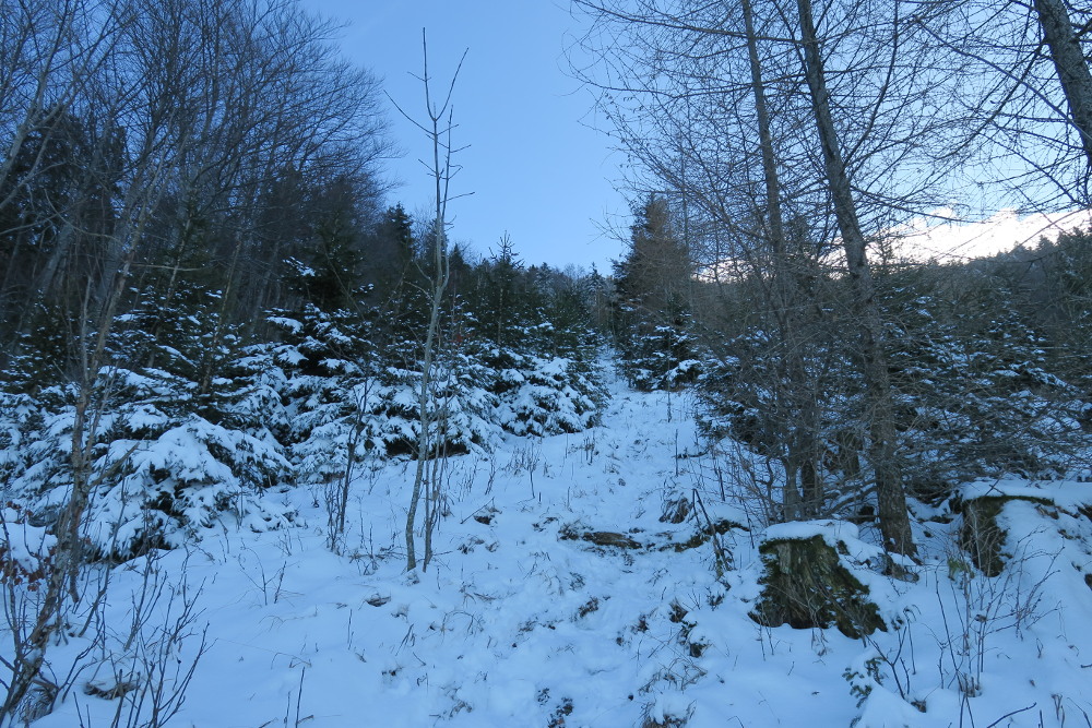 Bild 9: Ich gehe zum zweiten Mal den Schlag, dieses Mal bei deutlich weniger Schnee und festgetretener Spur. Mit Spikes ein Traum.