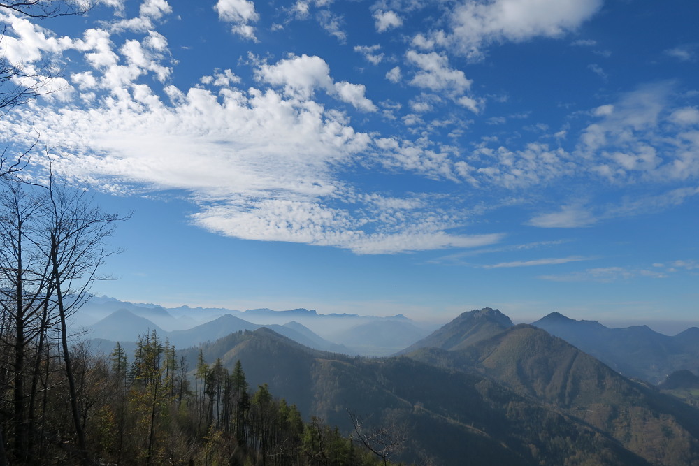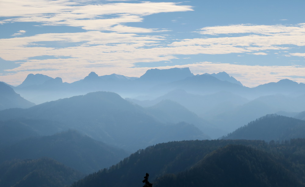 Ganz links Ötscher, ganz rechts Tamischbachturm. Über den Almkogel-Bodenwies-Kamm schaut außerdem der Eisenerzer Reichenstein.